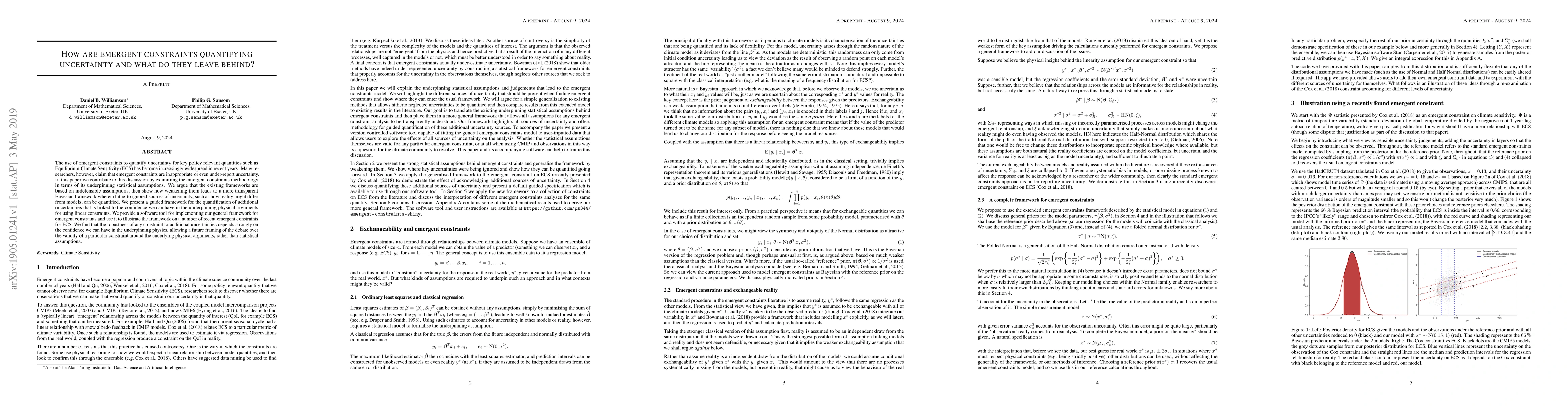 Research paper critiques the use of emergent constraints to quantify uncertainty in climate science, arguing that existing frameworks rely on indefensible assumptions, and proposes a new framework that prioritizes confidence in underlying physical arguments over statistical assumptions.