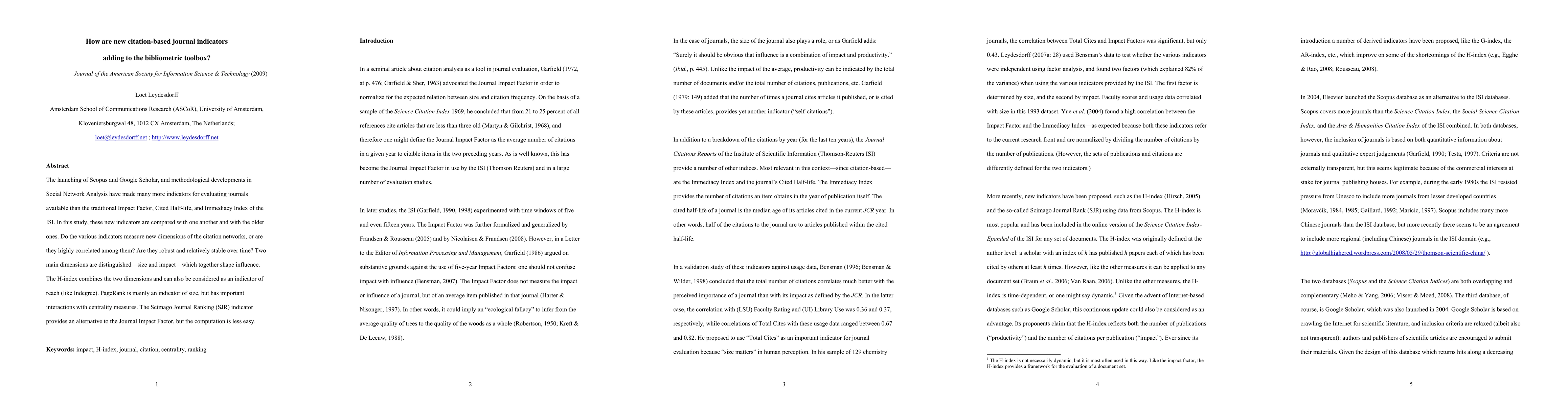 The launching of Scopus and Google Scholar, and methodological developments in Social Network Analysis have made many more indicators for evaluating journals available than the traditional Impact Factor, Cited Half-life, and Immediacy Index of the ISI. In this study, these new indicators are compared with one another and with the older ones. Do the various indicators measure new dimensions of the citation networks, or are they highly correlated among them? Are they robust and relatively stable over time? Two main dimensions are distinguished -- size and impact -- which together shape influence. The H-index combines the two dimensions and can also be considered as an indicator of reach (like Indegree). PageRank is mainly an indicator of size, but has important interactions with centrality measures. The Scimago Journal Ranking (SJR) indicator provides an alternative to the Journal Impact Factor, but the computation is less easy.
