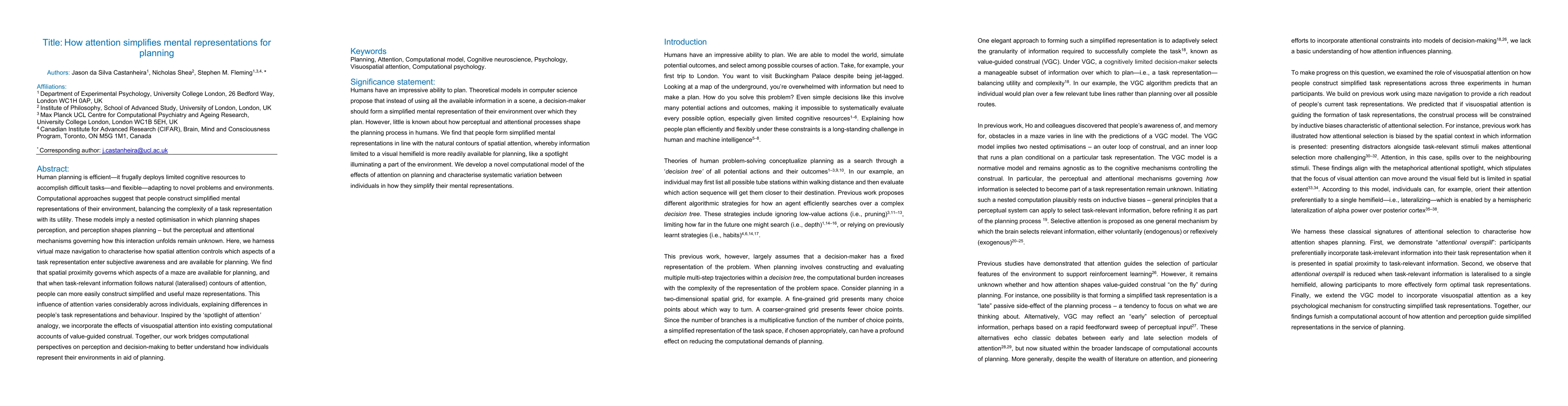 Human planning is efficient -- it frugally deploys limited cognitive resources to accomplish difficult tasks -- and flexible -- adapting to novel problems and environments. Computational approaches suggest that people construct simplified mental representations of their environment, balancing the complexity of a task representation with its utility. These models imply a nested optimisation in which planning shapes perception, and perception shapes planning -- but the perceptual and attentional mechanisms governing how this interaction unfolds remain unknown. Here, we harness virtual maze navigation to characterise how spatial attention controls which aspects of a task representation enter subjective awareness and are available for planning. We find that spatial proximity governs which aspects of a maze are available for planning, and that when task-relevant information follows natural (lateralised) contours of attention, people can more easily construct simplified and useful maze representations. This influence of attention varies considerably across individuals, explaining differences in people's task representations and behaviour. Inspired by the 'spotlight of attention' analogy, we incorporate the effects of visuospatial attention into existing computational accounts of value-guided construal. Together, our work bridges computational perspectives on perception and decision-making to better understand how individuals represent their environments in aid of planning.