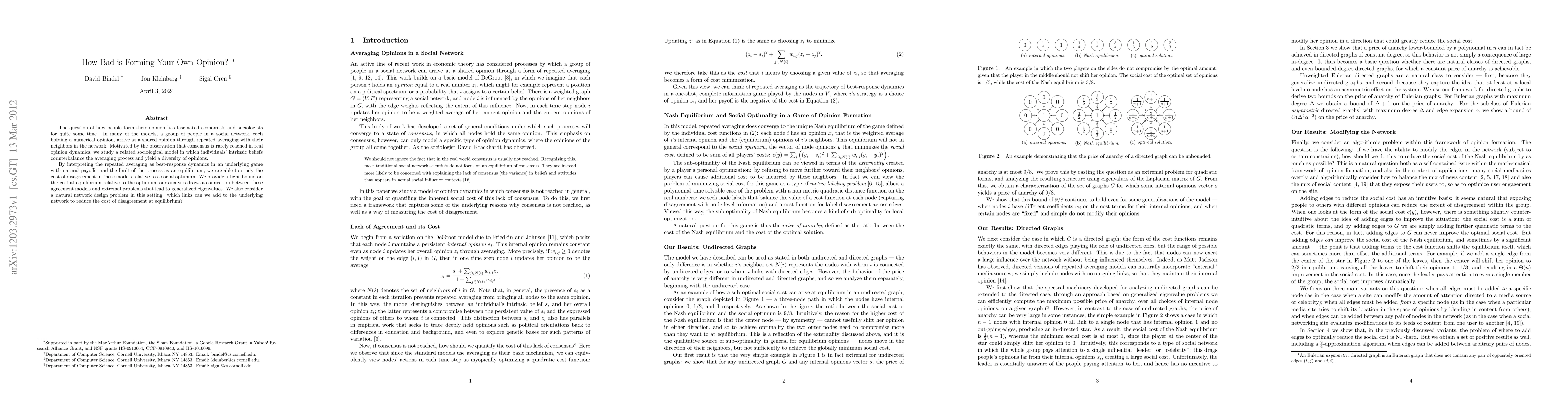 The question of how people form their opinion has fascinated economists and sociologists for quite some time. In many of the models, a group of people in a social network, each holding a numerical opinion, arrive at a shared opinion through repeated averaging with their neighbors in the network. Motivated by the observation that consensus is rarely reached in real opinion dynamics, we study a related sociological model in which individuals' intrinsic beliefs counterbalance the averaging process and yield a diversity of opinions. By interpreting the repeated averaging as best-response dynamics in an underlying game with natural payoffs, and the limit of the process as an equilibrium, we are able to study the cost of disagreement in these models relative to a social optimum. We provide a tight bound on the cost at equilibrium relative to the optimum; our analysis draws a connection between these agreement models and extremal problems that lead to generalized eigenvalues. We also consider a natural network design problem in this setting: which links can we add to the underlying network to reduce the cost of disagreement at equilibrium?
