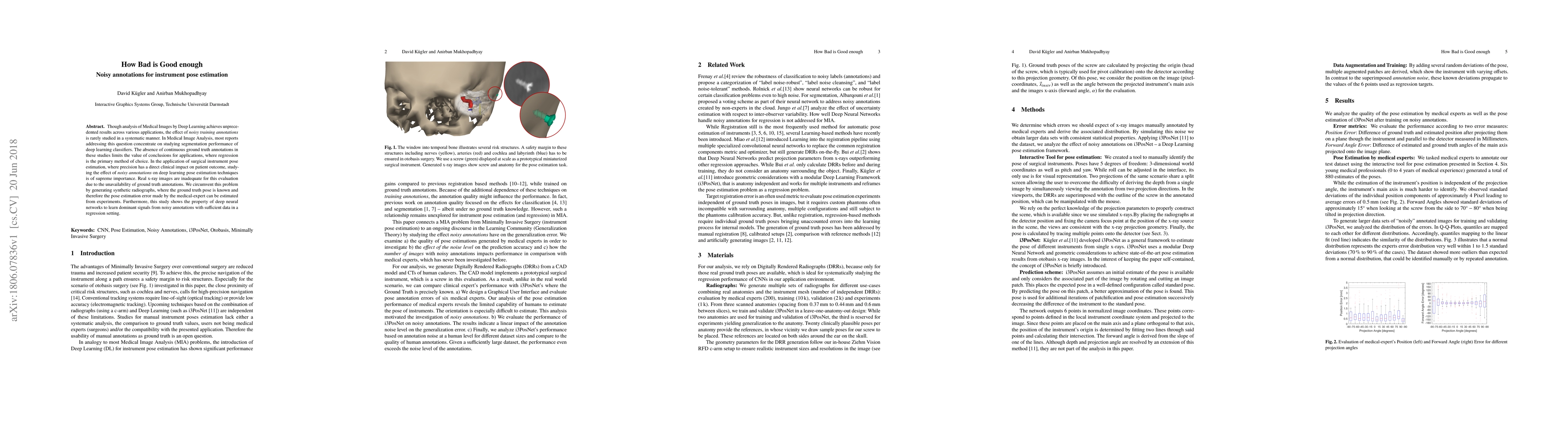 This paper investigates the impact of noisy annotations on deep learning techniques for surgical instrument pose estimation, demonstrating that despite noise, neural networks can still learn dominant signals effectively. Synthetic radiographs with known ground truth allow for accurate evaluation of pose estimation errors, highlighting the importance of this study for clinical applications where precision is crucial.