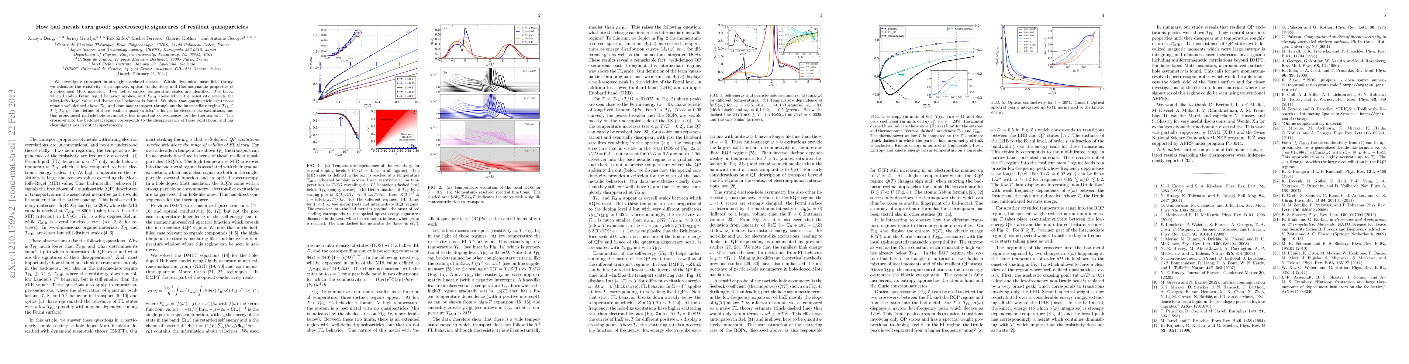 This paper explores transport properties in strongly correlated metals using dynamical mean-field theory, identifying two temperature regimes. Quasiparticle excitations remain resilient and dominate transport between these regimes, with electron-like excitations having longer lifetimes, influencing thermopower. The transition to bad-metal behavior is marked by the disappearance of these quasiparticles and is detectable via optical spectroscopy.