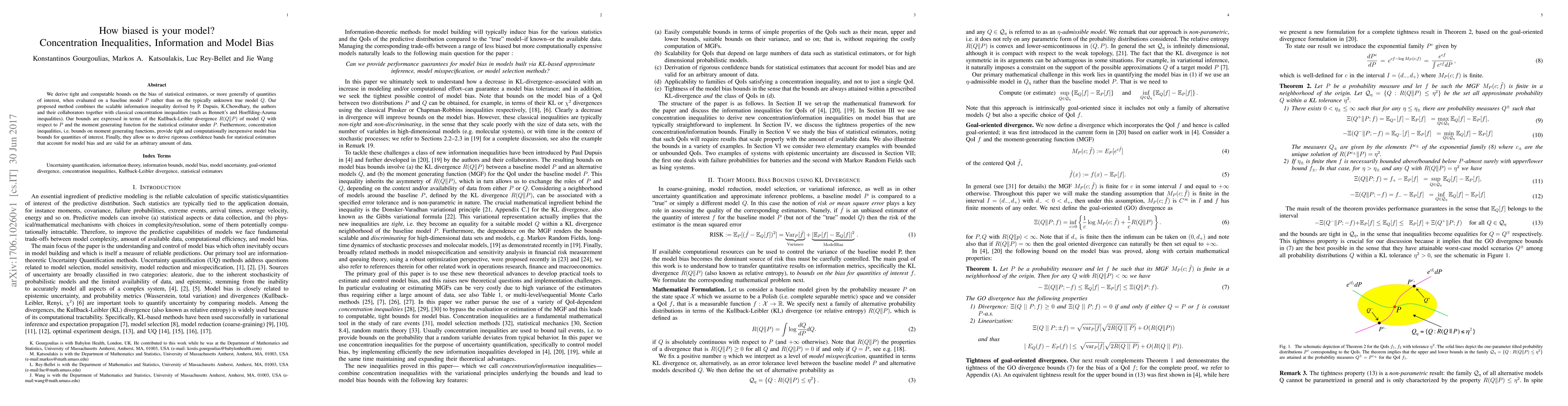 We derive tight and computable bounds on the bias of statistical estimators, or more generally of quantities of interest, when evaluated on a baseline model P rather than on the typically unknown true model Q. Our proposed method combines the scalable information inequality derived by P. Dupuis, K.Chowdhary, the authors and their collaborators together with classical concentration inequalities (such as Bennett's and Hoeffding-Azuma inequalities). Our bounds are expressed in terms of the Kullback-Leibler divergence R(Q||P) of model Q with respect to P and the moment generating function for the statistical estimator under P. Furthermore, concentration inequalities, i.e. bounds on moment generating functions, provide tight and computationally inexpensive model bias bounds for quantities of interest. Finally, they allow us to derive rigorous confidence bands for statistical estimators that account for model bias and are valid for an arbitrary amount of data.