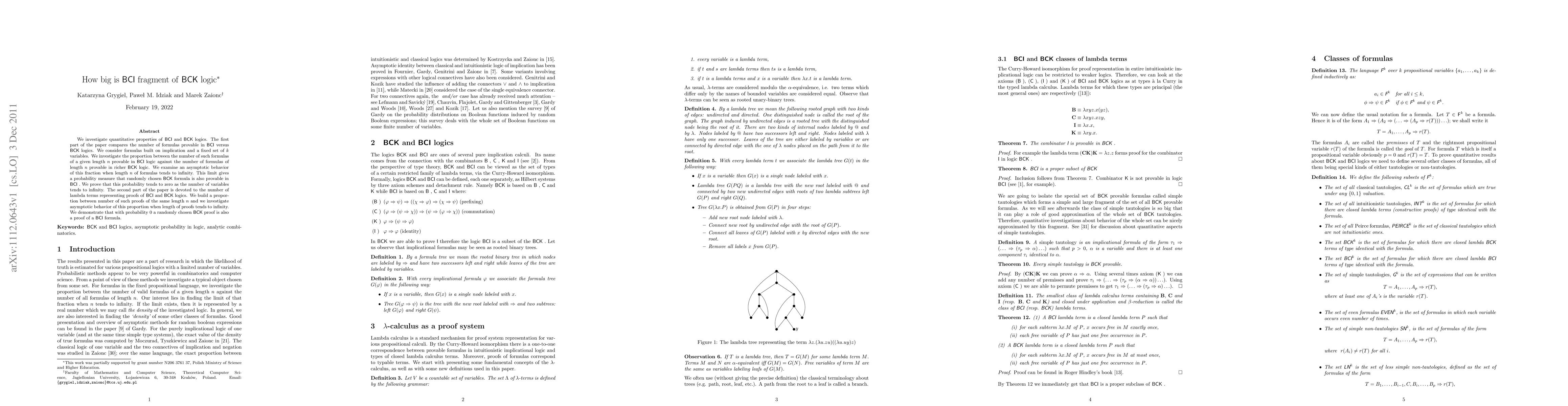 The paper investigates quantitative properties of BCI and BCK logics by comparing the number of formulas provable in each, focusing on formulas built on implication and a fixed set of k variables. It examines the asymptotic behavior of the proportion of BCI-provable formulas among all BCK-provable formulas as the length of formulas tends to infinity.