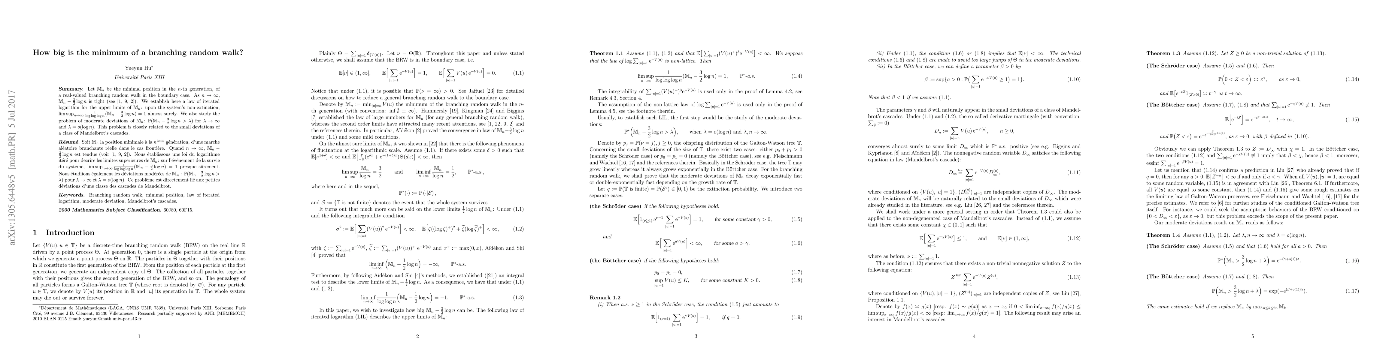Let $M_n$ be the minimal position at generation $n$, of a real-valued branching random walk in the boundary case. As $n \to \infty$, $M_n- {3 \over 2} \log n$ is tight (see [1][9][2]). We establish here a law of iterated logarithm for the upper limits of $M_n$: upon the system's non-extinction, $ \limsup\_{n\to \infty} {1\over \log \log \log n} ( M_n - {3\over2} \log n) = 1$ almost surely. We also study the problem of moderate deviations of $M_n$: $p(M_n- {3 \over 2} \log n > \lambda)$ for $\lambda\to \infty$ and $\lambda=o(\log n)$. This problem is closely related to the small deviations of a class of Mandelbrot's cascades.