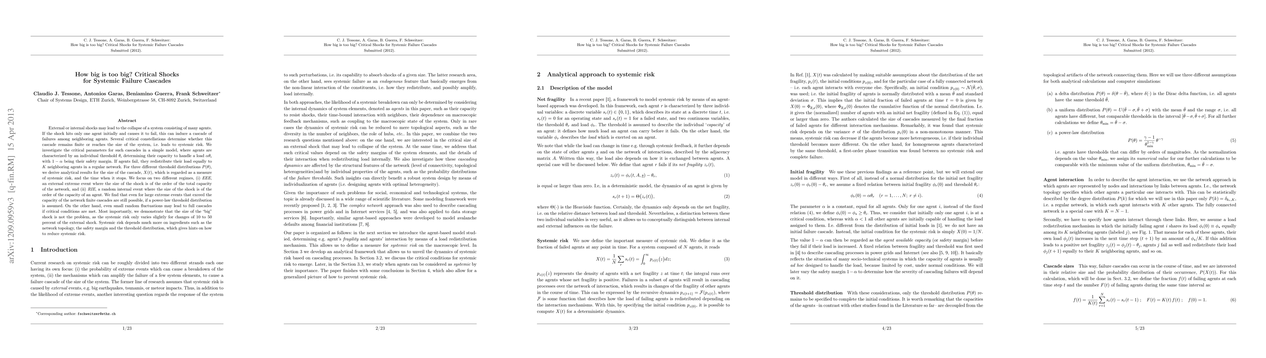 External or internal shocks may lead to the collapse of a system consisting of many agents. If the shock hits only one agent initially and causes it to fail, this can induce a cascade of failures among neighoring agents. Several critical constellations determine whether this cascade remains finite or reaches the size of the system, i.e. leads to systemic risk. We investigate the critical parameters for such cascades in a simple model, where agents are characterized by an individual threshold \theta_i determining their capacity to handle a load \alpha\theta_i with 1-\alpha being their safety margin. If agents fail, they redistribute their load equally to K neighboring agents in a regular network. For three different threshold distributions P(\theta), we derive analytical results for the size of the cascade, X(t), which is regarded as a measure of systemic risk, and the time when it stops. We focus on two different regimes, (i) EEE, an external extreme event where the size of the shock is of the order of the total capacity of the network, and (ii) RIE, a random internal event where the size of the shock is of the order of the capacity of an agent. We find that even for large extreme events that exceed the capacity of the network finite cascades are still possible, if a power-law threshold distribution is assumed. On the other hand, even small random fluctuations may lead to full cascades if critical conditions are met. Most importantly, we demonstrate that the size of the "big" shock is not the problem, as the systemic risk only varies slightly for changes of 10 to 50 percent of the external shock. Systemic risk depends much more on ingredients such as the network topology, the safety margin and the threshold distribution, which gives hints on how to reduce systemic risk.