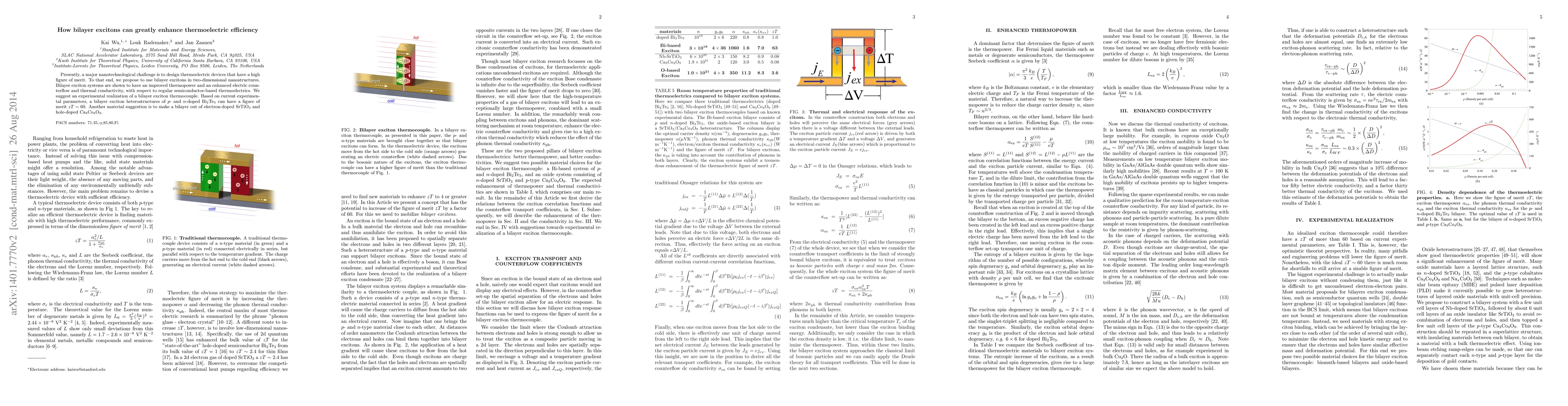 Currently, one of the major nanotechnological challenges is to design thermoelectric devices that have a high figure of merit. To that end, we propose to use bilayer excitons. Bilayer exciton systems are shown to have an improved thermopower and an enhanced electric counterflow and thermal conductivity, with respect to regular semiconductor-based thermoelectrics. Here we present a roadmap towards experimental realization of a bilayer exciton thermocouple. A bilayer exciton heterostructures of $p$- and $n$-doped Bi$_2$Te$_3$ can have a figure of merit $zT \sim 60$. Another material suggestion is to make a bilayer out of electron-doped SrTiO$_3$ and hole-doped Ca$_3$Co$_4$O$_9$.