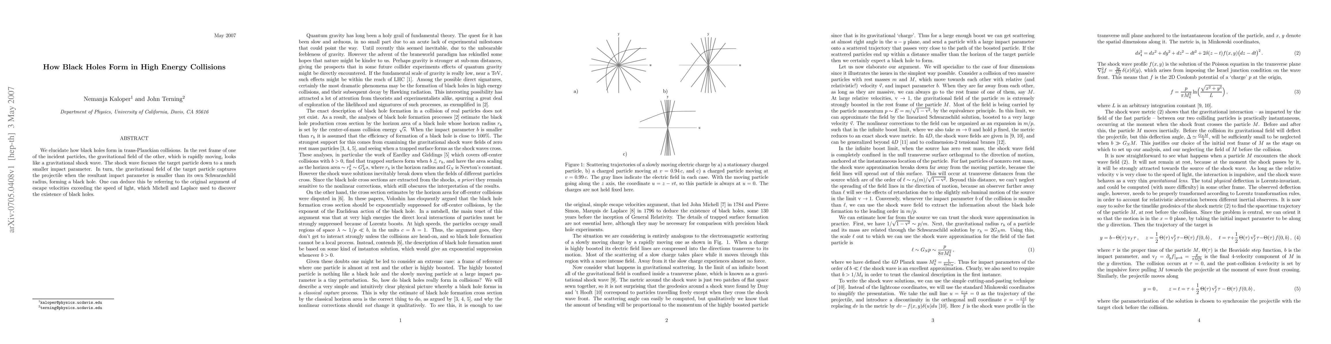 Black holes form in high-energy collisions when a rapidly moving particle creates a gravitational shock wave that focuses a target particle to its Schwarzschild radius, capturing it and creating a black hole.