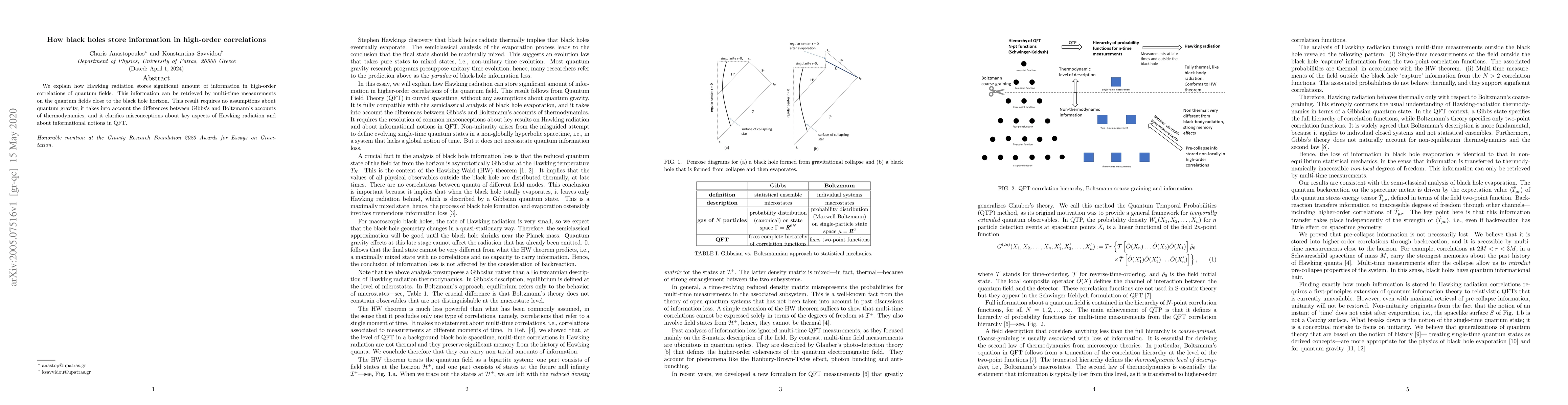 We explain how Hawking radiation stores significant amount of information in high-order correlations of quantum fields. This information can be retrieved by multi-time measurements on the quantum fields close to the black hole horizon. This result requires no assumptions about quantum gravity, it takes into account the differences between Gibbs's and Boltzmann's accounts of thermodynamics, and it clarifies misconceptions about key aspects of Hawking radiation and about informational notions in QFT.