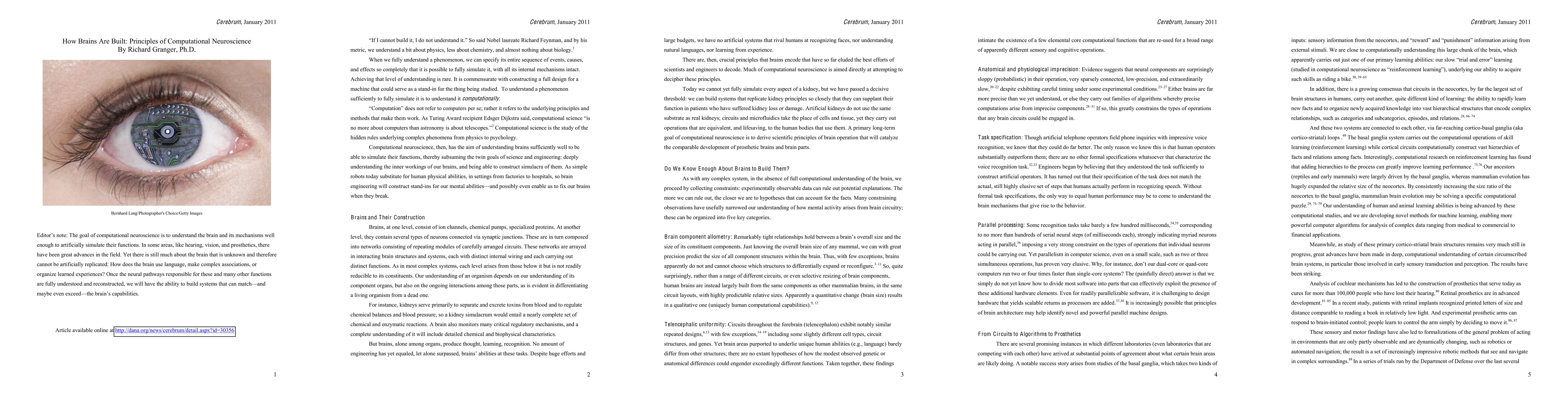 'If I cannot build it, I do not understand it.' So said Nobel laureate Richard Feynman, and by his metric, we understand a bit about physics, less about chemistry, and almost nothing about biology. When we fully understand a phenomenon, we can specify its entire sequence of events, causes, and effects so completely that it is possible to fully simulate it, with all its internal mechanisms intact. Achieving that level of understanding is rare. It is commensurate with constructing a full design for a machine that could serve as a stand-in for the thing being studied. To understand a phenomenon sufficiently to fully simulate it is to understand it computationally. 'Computation' does not refer to computers per se. Rather, it refers to the underlying principles and methods that make them work. As Turing Award recipient Edsger Dijkstra said, computational science 'is no more about computers than astronomy is about telescopes.' Computational science is the study of the hidden rules underlying complex phenomena from physics to psychology. Computational neuroscience, then, has the aim of understanding brains sufficiently well to be able to simulate their functions, thereby subsuming the twin goals of science and engineering: deeply understanding the inner workings of our brains, and being able to construct simulacra of them. As simple robots today substitute for human physical abilities, in settings from factories to hospitals, so brain engineering will construct stand-ins for our mental abilities, and possibly even enable us to fix our brains when they break.