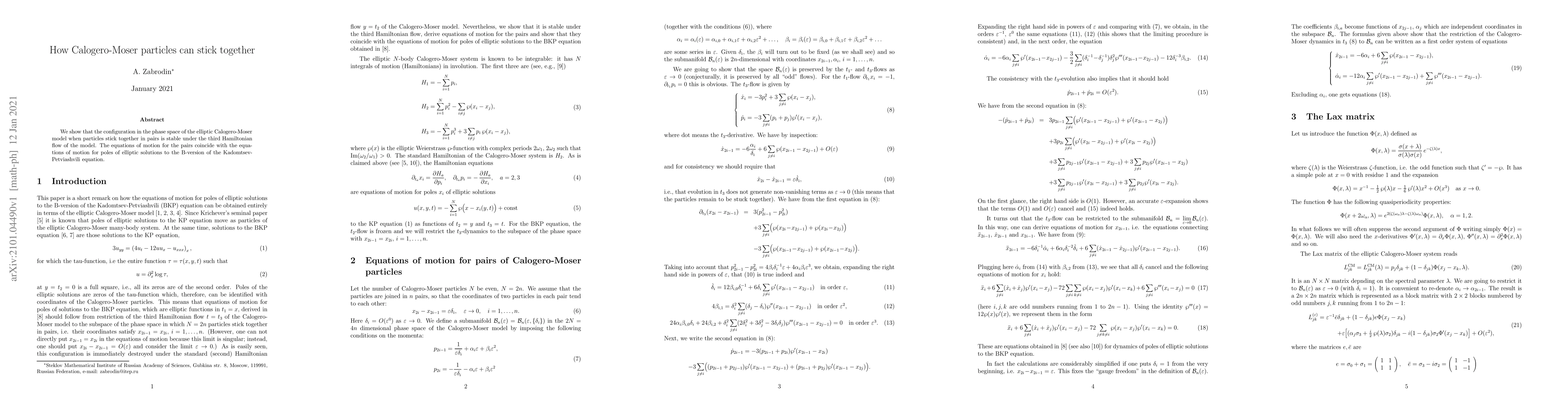 We show that the configuration in the phase space of the elliptic Calogero-Moser model when particles stick together in pairs is stable under the third Hamiltonian flow of the model. The equations of motion for the pairs coincide with the equations of motion for poles of elliptic solutions to the B-version of the Kadomtsev-Petviashvili equation.