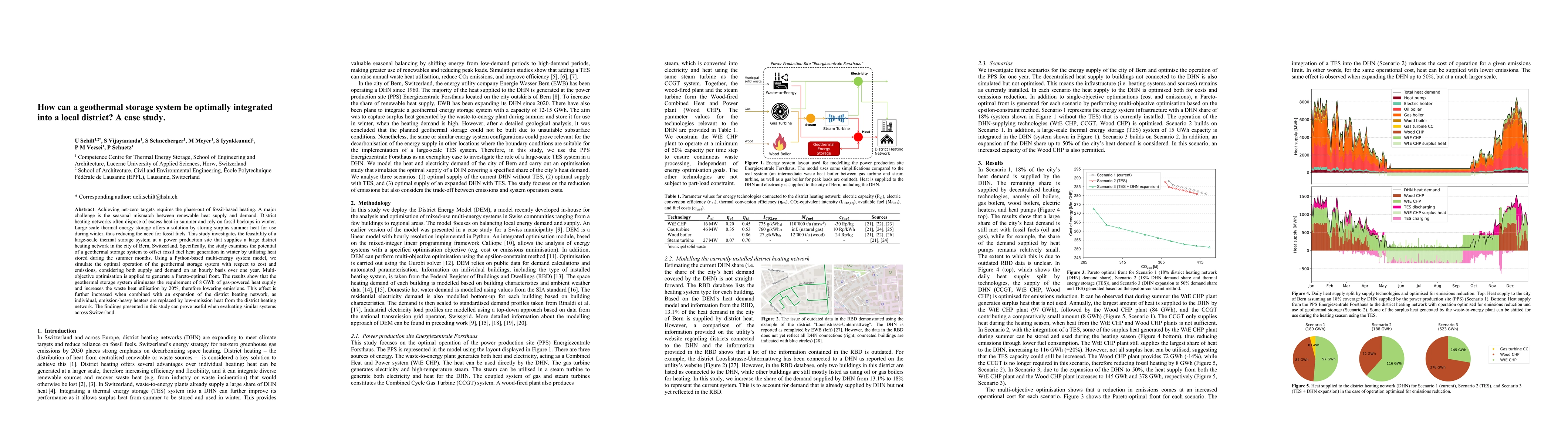 Achieving net-zero targets requires the phase-out of fossil-based heating. A major challenge is the seasonal mismatch between renewable heat supply and demand. District heating networks often dispose of excess heat in summer and rely on fossil backups in winter. Large-scale thermal energy storage offers a solution by storing surplus summer heat for use during winter, thus reducing the need for fossil fuels. This study investigates the feasibility of a large-scale thermal storage system at a power production site that supplies a large district heating network in the city of Bern, Switzerland. Specifically, the study examines the potential of a geothermal storage system to offset fossil fuel heat generation in winter by utilising heat stored during the summer months. Using a Python-based multi-energy system model, we simulate the optimal operation of the geothermal storage system with respect to cost and emissions, considering both supply and demand on an hourly basis over one year. Multi-objective optimisation is applied to generate a Pareto-optimal front. The results show that the geothermal storage system eliminates the requirement of 8 GWh of gas-powered heat supply and increases the waste heat utilisation by 20%, therefore lowering emissions. This effect is further increased when combined with an expansion of the district heating network, as individual, emission-heavy heaters are replaced by low-emission heat from the district heating network. The findings presented in this study can prove useful when evaluating similar systems across Switzerland.