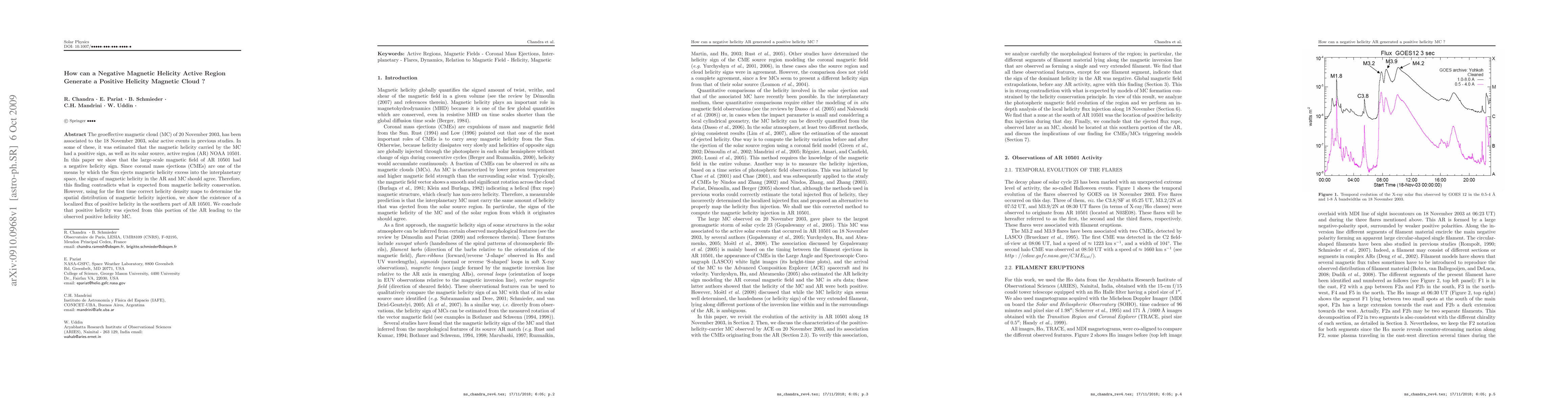 The geoeffective magnetic cloud (MC) of 20 November 2003, has been associated to the 18 November 2003, solar active events in previous studies. In some of these, it was estimated that the magnetic helicity carried by the MC had a positive sign, as well as its solar source, active region (AR) NOAA 10501. In this paper we show that the large-scale magnetic field of AR 10501 had a negative helicity sign. Since coronal mass ejections (CMEs) are one of the means by which the Sun ejects magnetic helicity excess into the interplanetary space, the signs of magnetic helicity in the AR and MC should agree. Therefore, this finding contradicts what is expected from magnetic helicity conservation. However, using for the first time correct helicity density maps to determine the spatial distribution of magnetic helicity injection, we show the existence of a localized flux of positive helicity in the southern part of AR 10501. We conclude that positive helicity was ejected from this portion of the AR leading to the observed positive helicity MC.