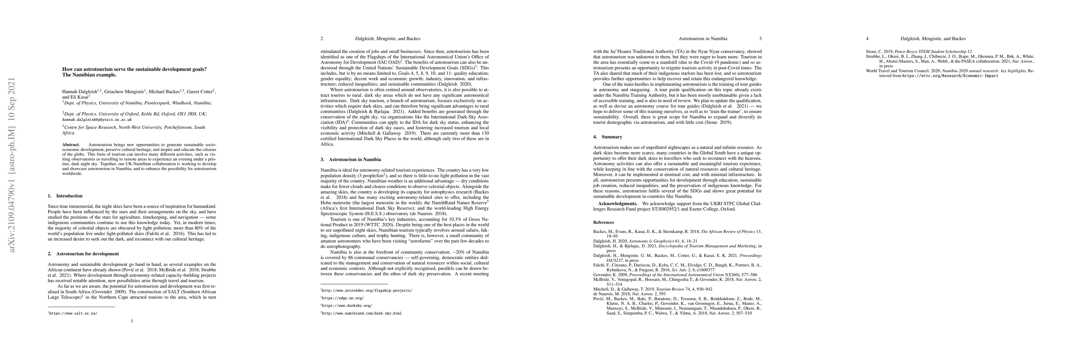 Summary: This study explores how astrotourism in Namibia can contribute to sustainable socio-economic development and cultural preservation, aiming to inspire global citizens and promote worldwide astrotourism. The UK-Namibian collaboration seeks to develop and showcase this form of tourism in Namibia.