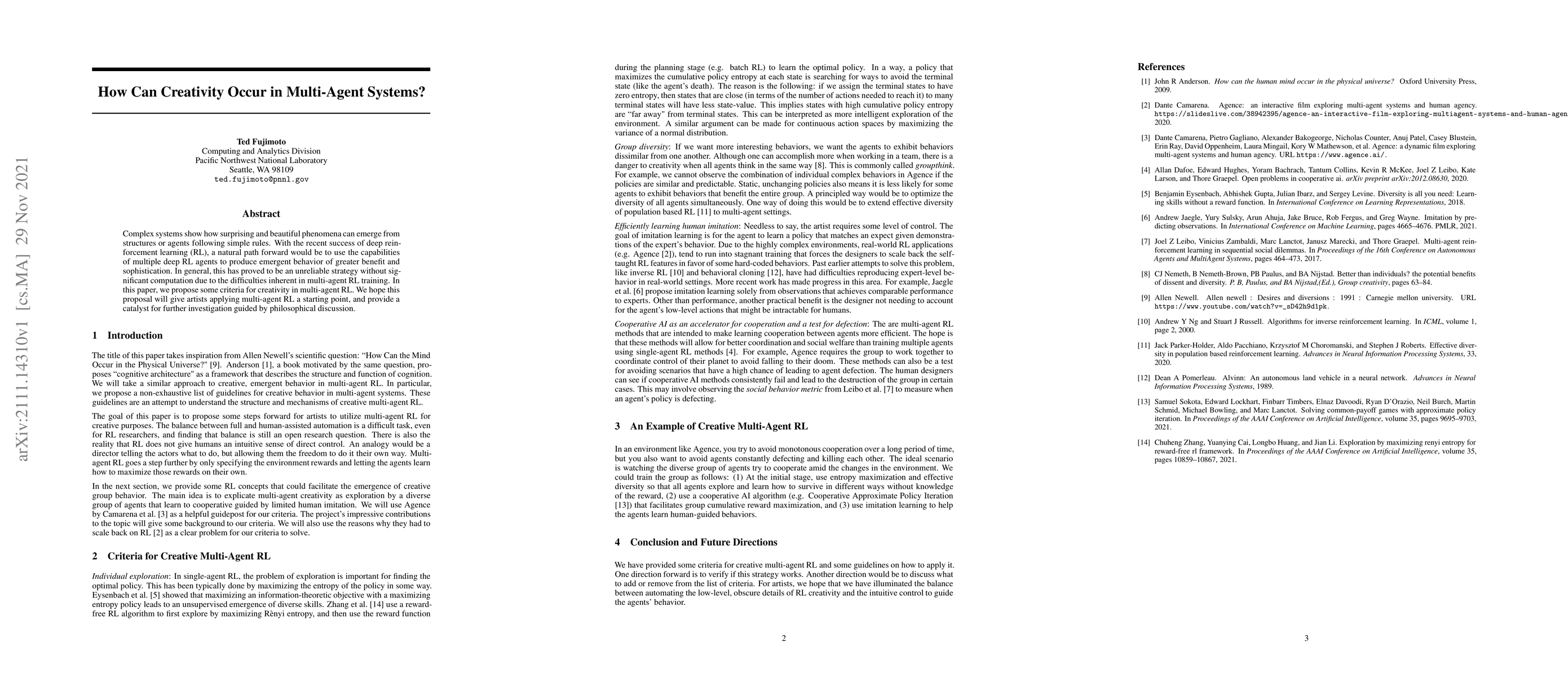 Complex systems show how surprising and beautiful phenomena can emerge from structures or agents following simple rules. With the recent success of deep reinforcement learning (RL), a natural path forward would be to use the capabilities of multiple deep RL agents to produce emergent behavior of greater benefit and sophistication. In general, this has proved to be an unreliable strategy without significant computation due to the difficulties inherent in multi-agent RL training. In this paper, we propose some criteria for creativity in multi-agent RL. We hope this proposal will give artists applying multi-agent RL a starting point, and provide a catalyst for further investigation guided by philosophical discussion.