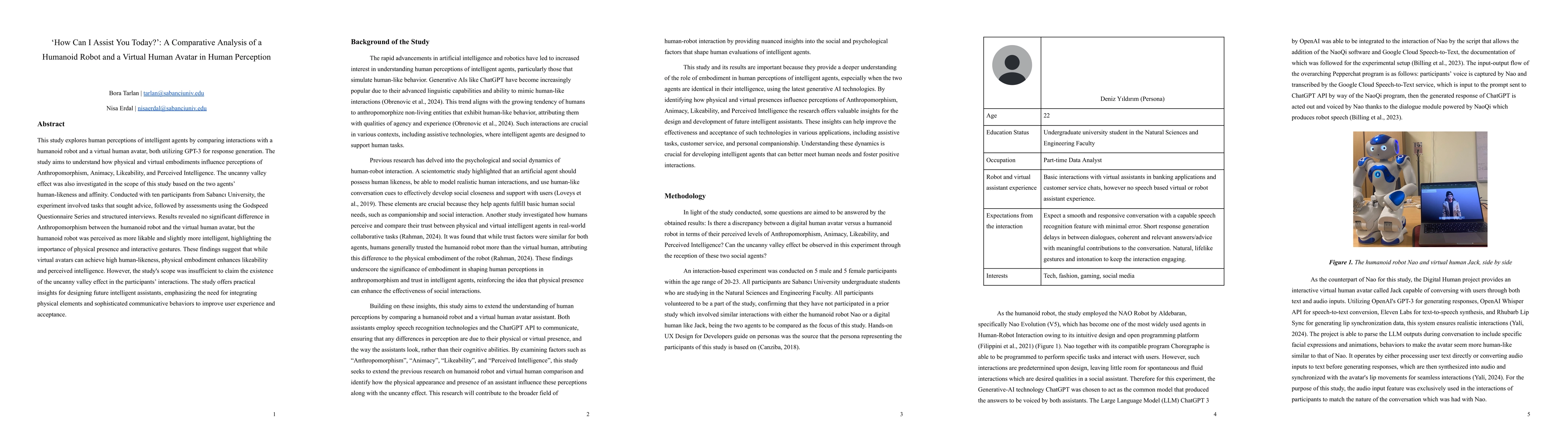 This study explores human perceptions of intelligent agents by comparing interactions with a humanoid robot and a virtual human avatar, both utilizing GPT-3 for response generation. The study aims to understand how physical and virtual embodiments influence perceptions of anthropomorphism, animacy, likeability, and perceived intelligence. The uncanny valley effect was also investigated in the scope of this study based on the two agents' human-likeness and affinity. Conducted with ten participants from Sabanci University, the experiment involved tasks that sought advice, followed by assessments using the Godspeed Questionnaire Series and structured interviews. Results revealed no significant difference in anthropomorphism between the humanoid robot and the virtual human avatar, but the humanoid robot was perceived as more likable and slightly more intelligent, highlighting the importance of physical presence and interactive gestures. These findings suggest that while virtual avatars can achieve high human-likeness, physical embodiment enhances likeability and perceived intelligence. However, the study's scope was insufficient to claim the existence of the uncanny valley effect in the participants' interactions. The study offers practical insights for designing future intelligent assistants, emphasizing the need for integrating physical elements and sophisticated communicative behaviors to improve user experience and acceptance.