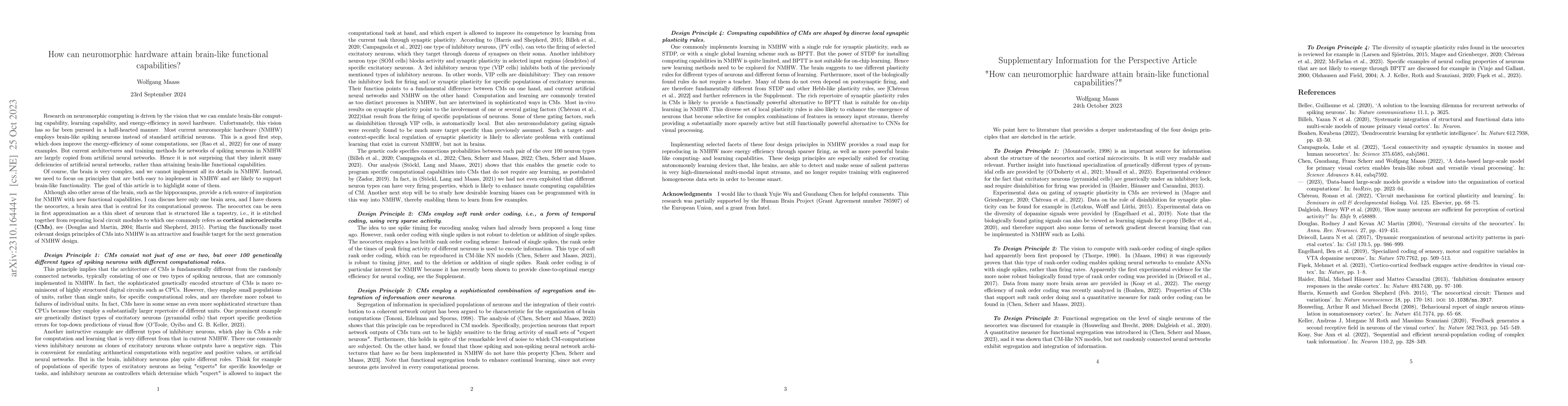 Research on neuromorphic computing is driven by the vision that we can emulate brain-like computing capability, learning capability, and energy-efficiency in novel hardware. Unfortunately, this vision has so far been pursued in a half-hearted manner. Most current neuromorphic hardware (NMHW) employs brain-like spiking neurons instead of standard artificial neurons. This is a good first step, which does improve the energy-efficiency of some computations, see \citep{rao2022long} for one of many examples. But current architectures and training methods for networks of spiking neurons in NMHW are largely copied from artificial neural networks. Hence it is not surprising that they inherit many deficiencies of artificial neural networks, rather than attaining brain-like functional capabilities. Of course, the brain is very complex, and we cannot implement all its details in NMHW. Instead, we need to focus on principles that are both easy to implement in NMHW and are likely to support brain-like functionality. The goal of this article is to highlight some of them.