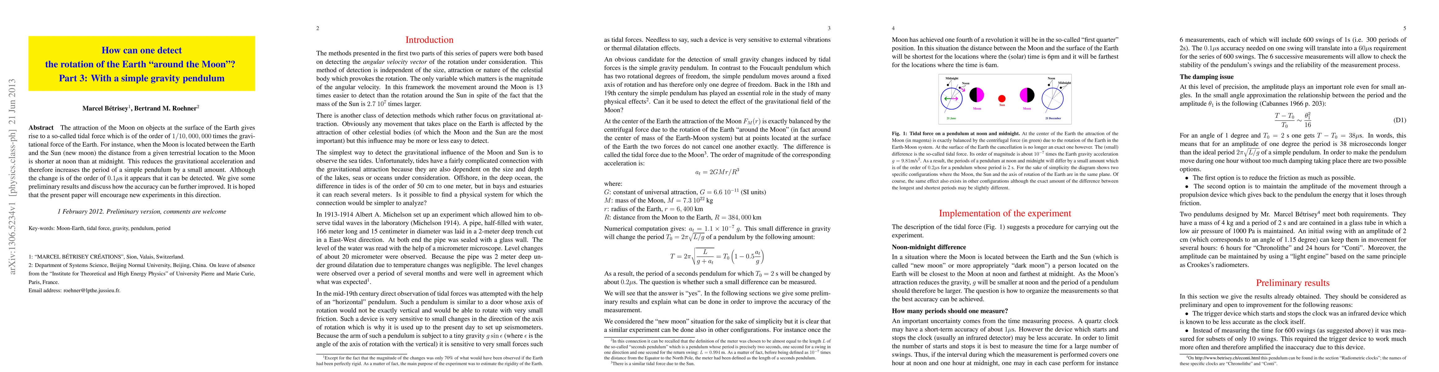 The attraction of the Moon on objects at the surface of the Earth gives rise to a so-called tidal force which is of the order of 1/10,000,000 times the gravitational force of the Earth. For instance, when the Moon is located between the Earth and the Sun (new moon) the distance from a given terrestrial location to the Moon is shorter at noon than at midnight. This reduces the gravitational acceleration and therefore increases the period of a simple pendulum by a small amount. Although the change is of the order of 100 nanoseconds it appears that it can be detected. We give some preliminary results and discuss how the accuracy can be further improved. It is hoped that the present paper will encourage new experiments in this direction.