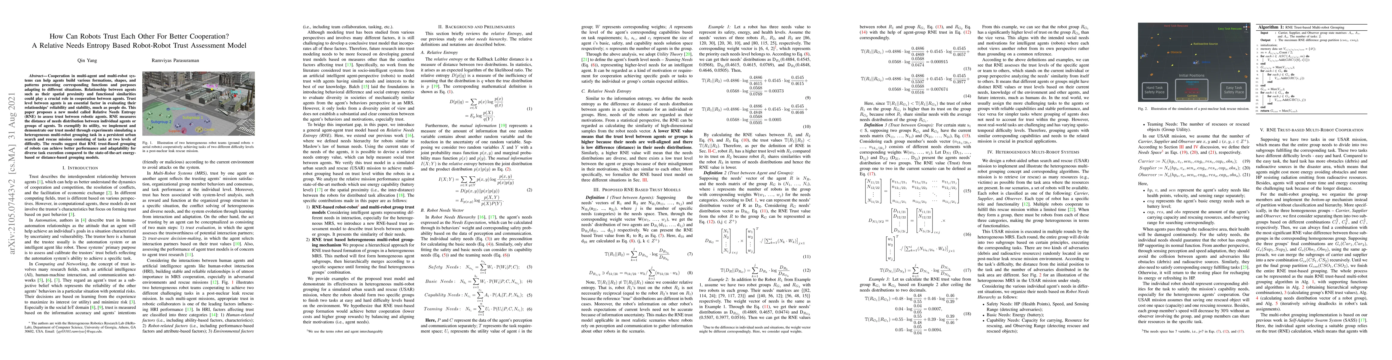 Cooperation in multi-agent and multi-robot systems can help agents build various formations, shapes, and patterns presenting corresponding functions and purposes adapting to different situations. Relationships between agents such as their spatial proximity and functional similarities could play a crucial role in cooperation between agents. Trust level between agents is an essential factor in evaluating their relationships' reliability and stability, much as people do. This paper proposes a new model called Relative Needs Entropy (RNE) to assess trust between robotic agents. RNE measures the distance of needs distribution between individual agents or groups of agents. To exemplify its utility, we implement and demonstrate our trust model through experiments simulating a heterogeneous multi-robot grouping task in a persistent urban search and rescue mission consisting of tasks at two levels of difficulty. The results suggest that RNE trust-Based grouping of robots can achieve better performance and adaptability for diverse task execution compared to the state-of-the-art energy-based or distance-based grouping models.