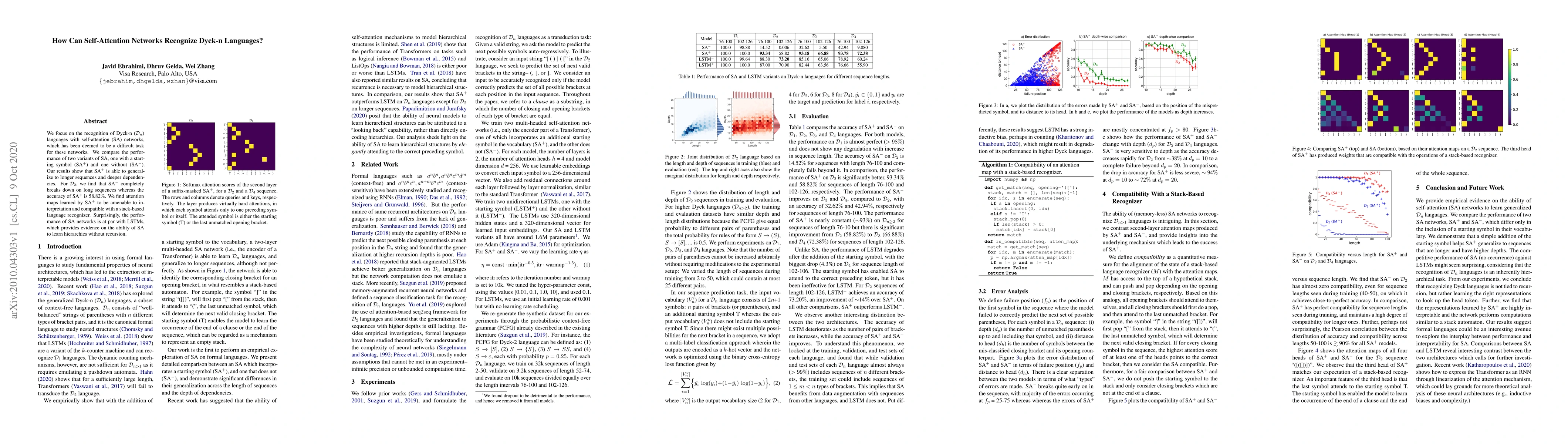 This paper investigates the use of self-attention networks to recognize Dyck-n languages, finding that the variant with a starting symbol (SA$^+$) outperforms its counterpart without (SA$^-$). SA$^+$ demonstrates better generalization and interpretable attention maps, achieving comparable performance to LSTMs, suggesting self-attention's capacity to learn hierarchical structures without recursion.