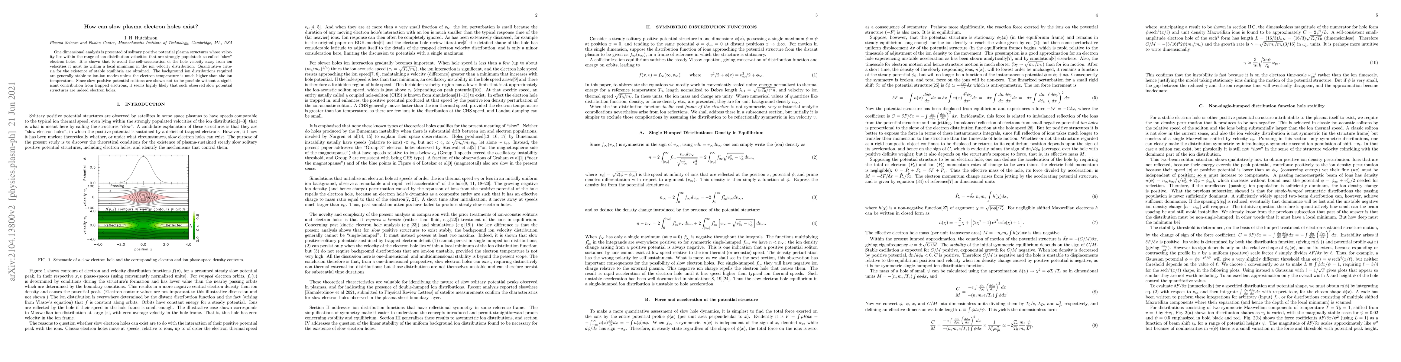 This paper explores the existence of slow plasma electron holes, finding they must reside in local minima of ion velocity distribution to maintain stability. The study suggests observed slow potential structures are likely electron holes, requiring significant trapped electron contribution.