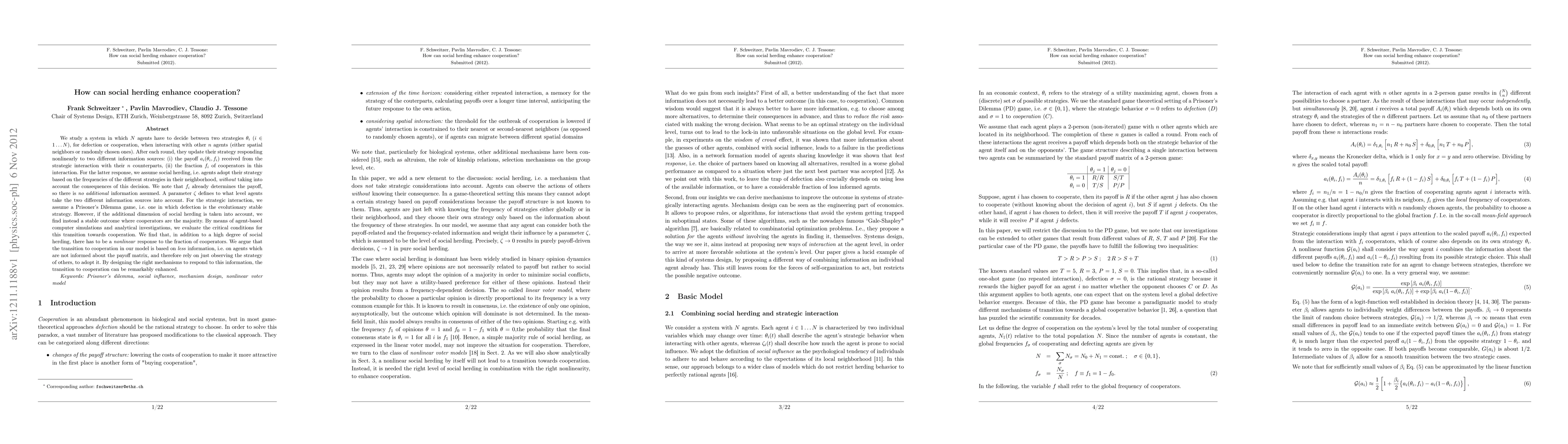 We study a system in which N agents have to decide between two strategies \theta_i (i \in 1... N), for defection or cooperation, when interacting with other n agents (either spatial neighbors or randomly chosen ones). After each round, they update their strategy responding nonlinearly to two different information sources: (i) the payoff a_i(\theta_i, f_i) received from the strategic interaction with their n counterparts, (ii) the fraction f_i of cooperators in this interaction. For the latter response, we assume social herding, i.e. agents adopt their strategy based on the frequencies of the different strategies in their neighborhood, without taking into account the consequences of this decision. We note that f_i already determines the payoff, so there is no additional information assumed. A parameter \zeta defines to what level agents take the two different information sources into account. For the strategic interaction, we assume a Prisoner's Dilemma game, i.e. one in which defection is the evolutionary stable strategy. However, if the additional dimension of social herding is taken into account, we find instead a stable outcome where cooperators are the majority. By means of agent-based computer simulations and analytical investigations, we evaluate the critical conditions for this transition towards cooperation. We find that, in addition to a high degree of social herding, there has to be a nonlinear response to the fraction of cooperators. We argue that the transition to cooperation in our model is based on less information, i.e. on agents which are not informed about the payoff matrix, and therefore rely on just observing the strategy of others, to adopt it. By designing the right mechanisms to respond to this information, the transition to cooperation can be remarkably enhanced.