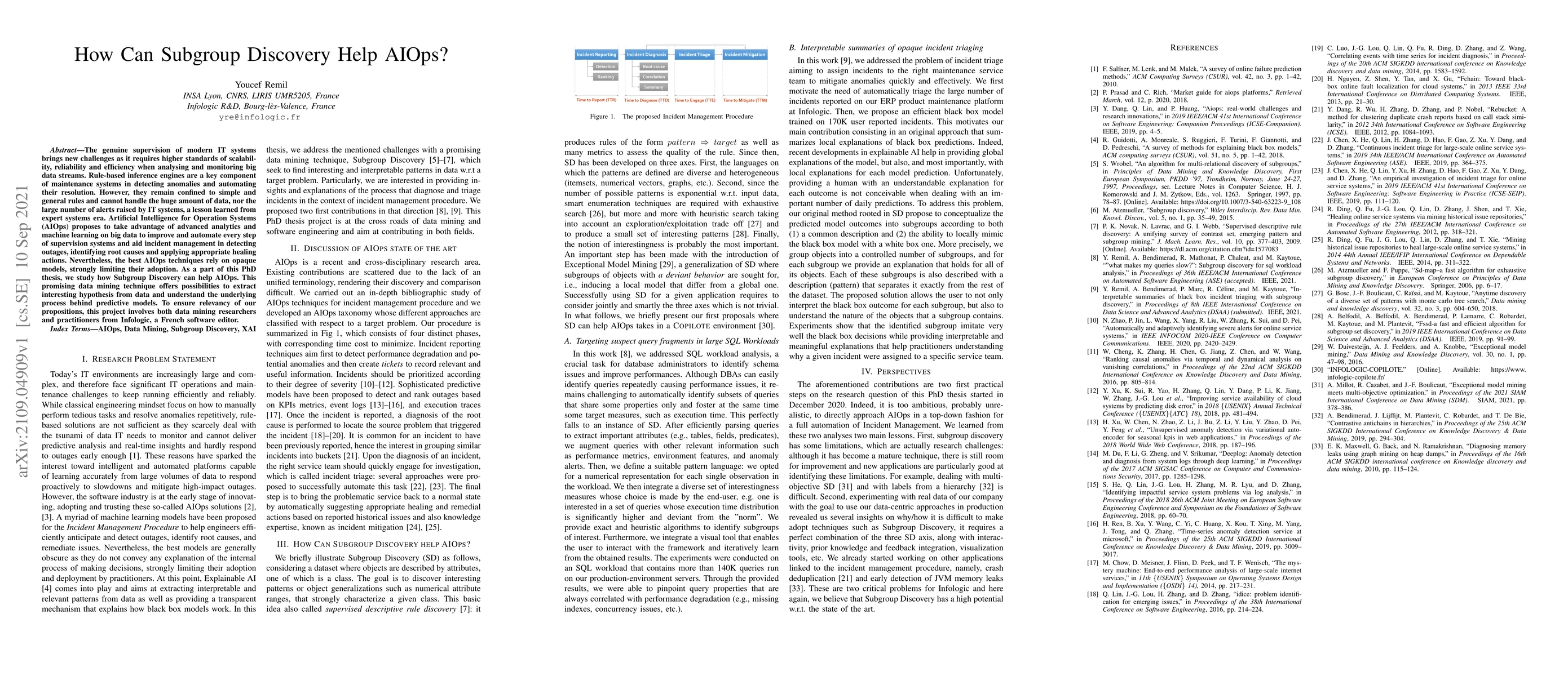 The genuine supervision of modern IT systems brings new challenges as it requires higher standards of scalability, reliability and efficiency when analysing and monitoring big data streams. Rule-based inference engines are a key component of maintenance systems in detecting anomalies and automating their resolution. However, they remain confined to simple and general rules and cannot handle the huge amount of data, nor the large number of alerts raised by IT systems, a lesson learned from expert systems era. Artificial Intelligence for Operation Systems (AIOps) proposes to take advantage of advanced analytics and machine learning on big data to improve and automate every step of supervision systems and aid incident management in detecting outages, identifying root causes and applying appropriate healing actions. Nevertheless, the best AIOps techniques rely on opaque models, strongly limiting their adoption. As a part of this PhD thesis, we study how Subgroup Discovery can help AIOps. This promising data mining technique offers possibilities to extract interesting hypothesis from data and understand the underlying process behind predictive models. To ensure relevancy of our propositions, this project involves both data mining researchers and practitioners from Infologic, a French software editor.