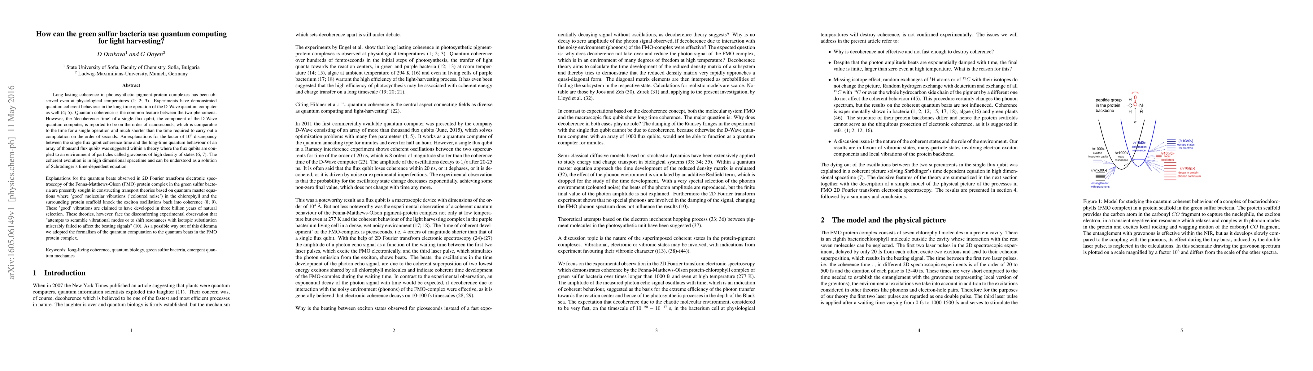 This paper explores the potential for green sulfur bacteria's photosynthetic pigment-protein complexes to utilize quantum computing principles for light harvesting. It proposes that quantum coherence observed in both bacterial complexes and D-Wave quantum computers could be explained by coupling flux qubits to high-density gravonon particles, suggesting a high-dimensional spacetime solution to Schrödinger's equation.