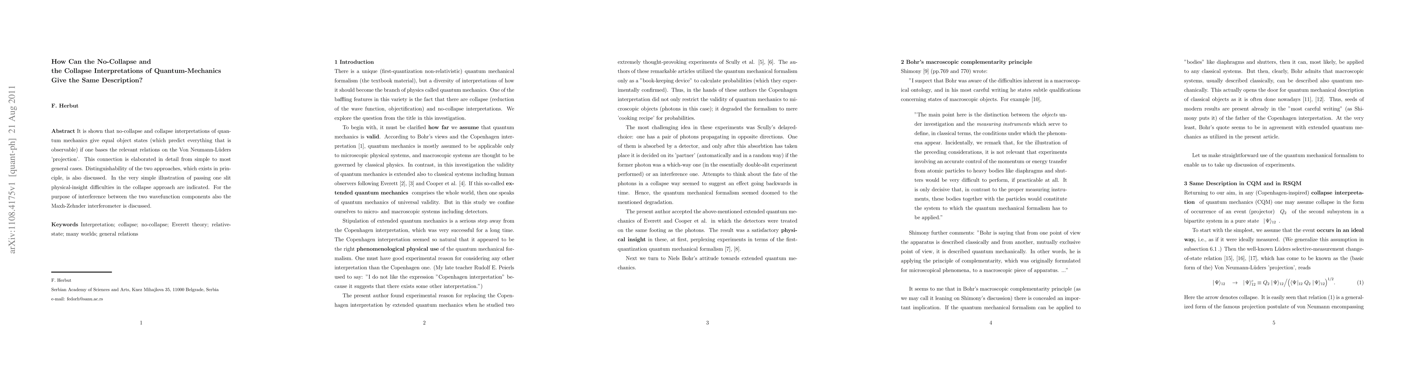 It is shown that no-collapse and collapse interpretations of quantum mechanics give equal object states (which predict everything that is observable) if one bases the relevant relations on the Von Neumann-L\"uders 'projection'. This connection is elaborated in detail from simple to most general cases. Distinguishability of the two approaches, which exists in principle, is also discussed. In the very simple illustration of passing one slit physical-insight difficulties in the collapse approach are indicated. For the purpose of interference between the two wavefunction components also the Maxh-Zehnder interferometer is discussed.
