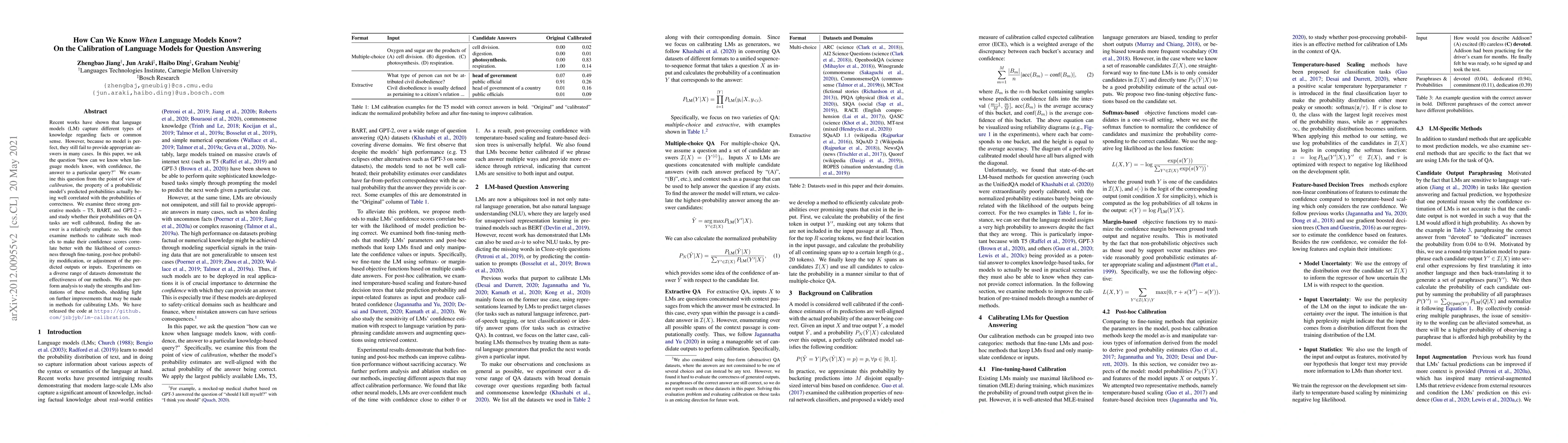 Recent works have shown that language models (LM) capture different types of knowledge regarding facts or common sense. However, because no model is perfect, they still fail to provide appropriate answers in many cases. In this paper, we ask the question "how can we know when language models know, with confidence, the answer to a particular query?" We examine this question from the point of view of calibration, the property of a probabilistic model's predicted probabilities actually being well correlated with the probabilities of correctness. We examine three strong generative models -- T5, BART, and GPT-2 -- and study whether their probabilities on QA tasks are well calibrated, finding the answer is a relatively emphatic no. We then examine methods to calibrate such models to make their confidence scores correlate better with the likelihood of correctness through fine-tuning, post-hoc probability modification, or adjustment of the predicted outputs or inputs. Experiments on a diverse range of datasets demonstrate the effectiveness of our methods. We also perform analysis to study the strengths and limitations of these methods, shedding light on further improvements that may be made in methods for calibrating LMs. We have released the code at https://github.com/jzbjyb/lm-calibration.