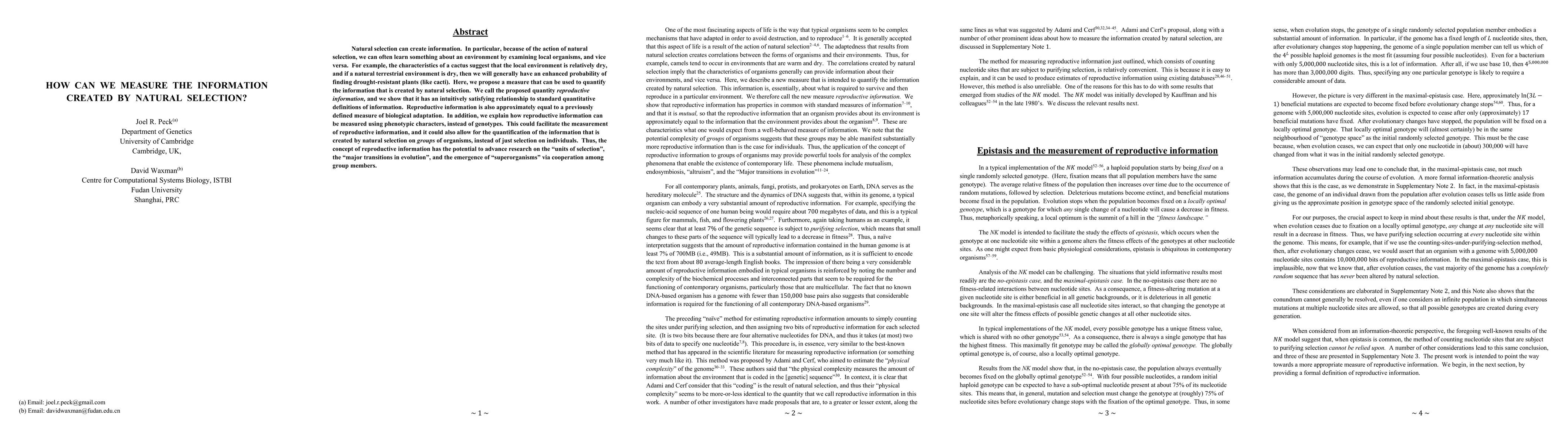Natural selection can create information. In particular, because of the action of natural selection, we can often learn something about an environment by examining local organisms, and vice versa. For example, the characteristics of a cactus suggest that the local environment is relatively dry, and if a natural terrestrial environment is dry, then we will generally have an enhanced probability of finding drought-resistant plants (like cacti). Here, we propose a measure that can be used to quantify the information that is created by natural selection. We call the proposed quantity reproductive information, and we show that it has an intuitively satisfying relationship to standard quantitative definitions of information. Reproductive information is also approximately equal to a previously defined measure of biological adaptation. In addition, we explain how reproductive information can be measured using phenotypic characters, instead of genotypes. This could facilitate the measurement of reproductive information, and it could also allow for the quantification of the information that is created by natural selection on groups of organisms, instead of just selection on individuals. Thus, the concept of reproductive information has the potential to advance research on the "units of selection", the "major transitions in evolution", and the emergence of "superorganisms" via cooperation among group members.