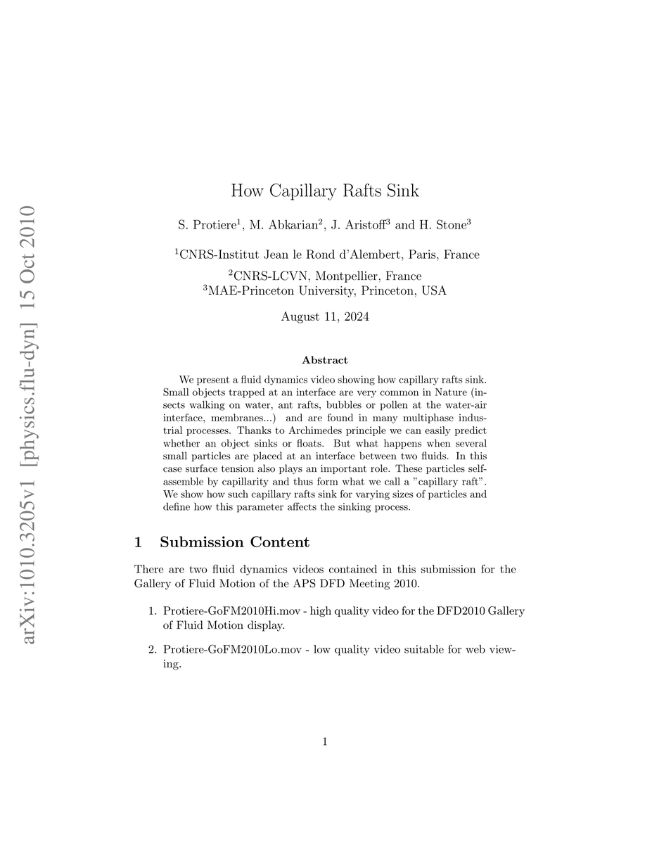 This paper investigates the fluid dynamics of capillary rafts, small objects self-assembled at the interface between two fluids due to surface tension. It demonstrates how these rafts sink, influenced by particle size, and provides insights into their behavior in natural and industrial contexts.