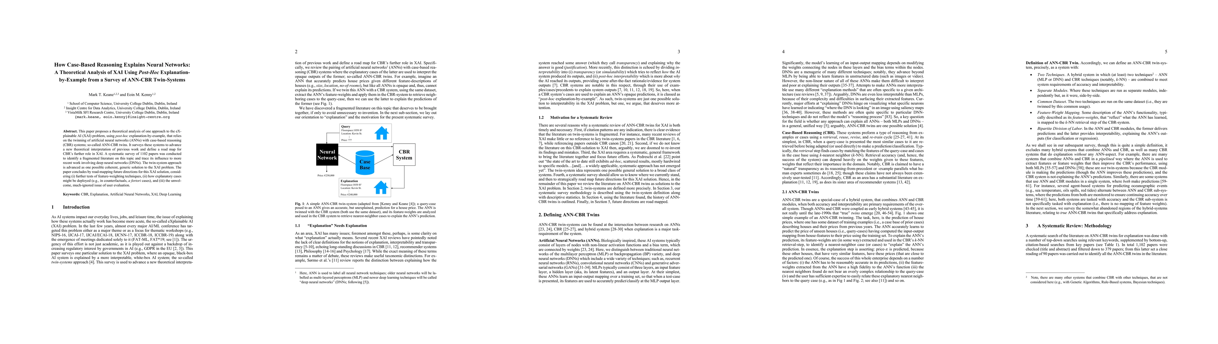 This paper surveys an approach to the XAI problem, using post-hoc explanation by example, that hinges on twinning Artificial Neural Networks (ANNs) with Case-Based Reasoning (CBR) systems, so-called ANN-CBR twins. A systematic survey of 1100+ papers was carried out to identify the fragmented literature on this topic and to trace it influence through to more recent work involving Deep Neural Networks (DNNs). The paper argues that this twin-system approach, especially using ANN-CBR twins, presents one possible coherent, generic solution to the XAI problem (and, indeed, XCBR problem). The paper concludes by road-mapping some future directions for this XAI solution involving (i) further tests of feature-weighting techniques, (iii) explorations of how explanatory cases might best be deployed (e.g., in counterfactuals, near-miss cases, a fortori cases), and (iii) the raising of the unwelcome and, much ignored, issue of human user evaluation.