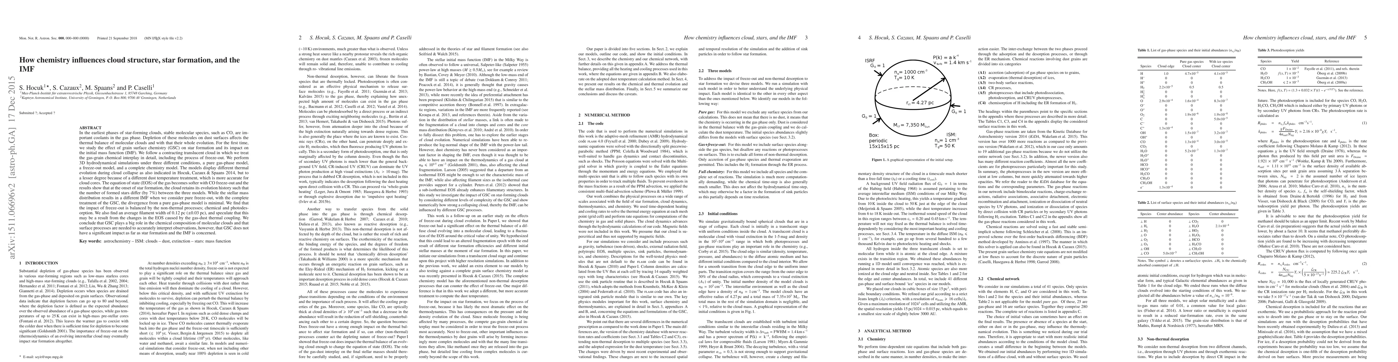 In the earliest phases of star-forming clouds, stable molecular species, such as CO, are important coolants in the gas phase. Depletion of these molecules on dust surfaces affects the thermal balance of molecular clouds and with that their whole evolution. For the first time, we study the effect of grain surface chemistry (GSC) on star formation and its impact on the initial mass function (IMF). We follow a contracting translucent cloud in which we treat the gas-grain chemical interplay in detail, including the process of freeze-out. We perform 3d hydrodynamical simulations under three different conditions, a pure gas-phase model, a freeze-out model, and a complete chemistry model. The models display different thermal evolution during cloud collapse. The equation of state (EOS) of the gas becomes softer with CO freeze-out and the results show that at the onset of star formation, the cloud retains its evolution history such that the number of formed stars differ (by 7%) between the three models. While the stellar mass distribution results in a different IMF when we consider pure freeze-out, with the complete treatment of the GSC, the divergence from a pure gas-phase model is minimal. We find that the impact of freeze-out is balanced by the non-thermal processes; chemical and photodesorption. We also find an average filament width of 0.12 pc ($\pm$0.03 pc), and speculate that this may be a result from the changes in the EOS caused by the gas-dust thermal coupling. We conclude that GSC plays a big role in the chemical composition of molecular clouds and that surface processes are needed to accurately interpret observations, however, that GSC does not have a significant impact as far as star formation and the IMF is concerned.
