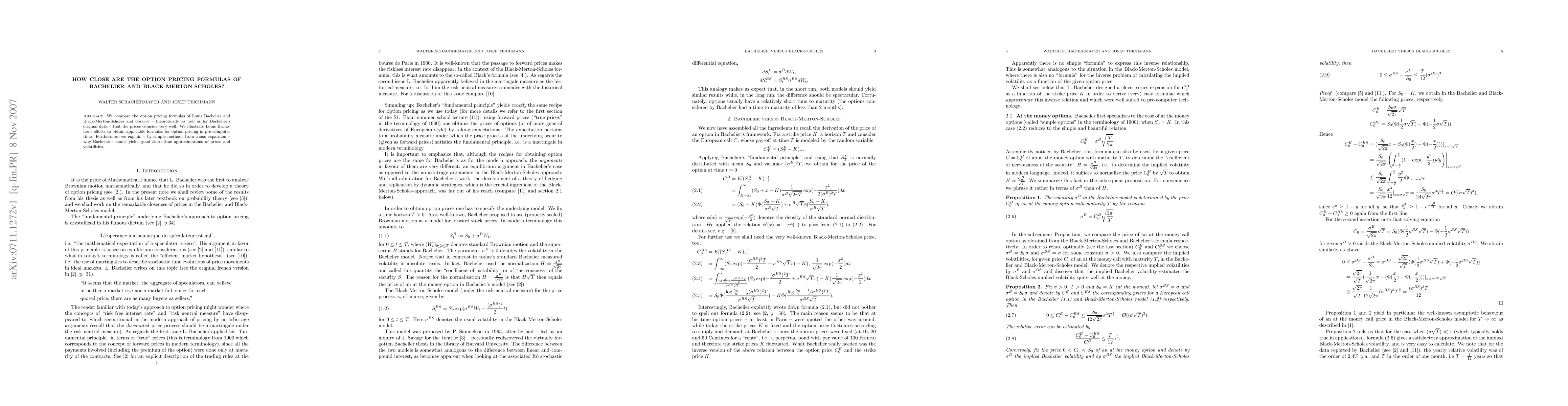 Summary: The paper compares Bachelier and Black-Merton-Scholes option pricing formulas, finding they closely match in theory and historical data, and explains Bachelier's pre-computer efforts and the mathematical reasons for his model's effectiveness.
