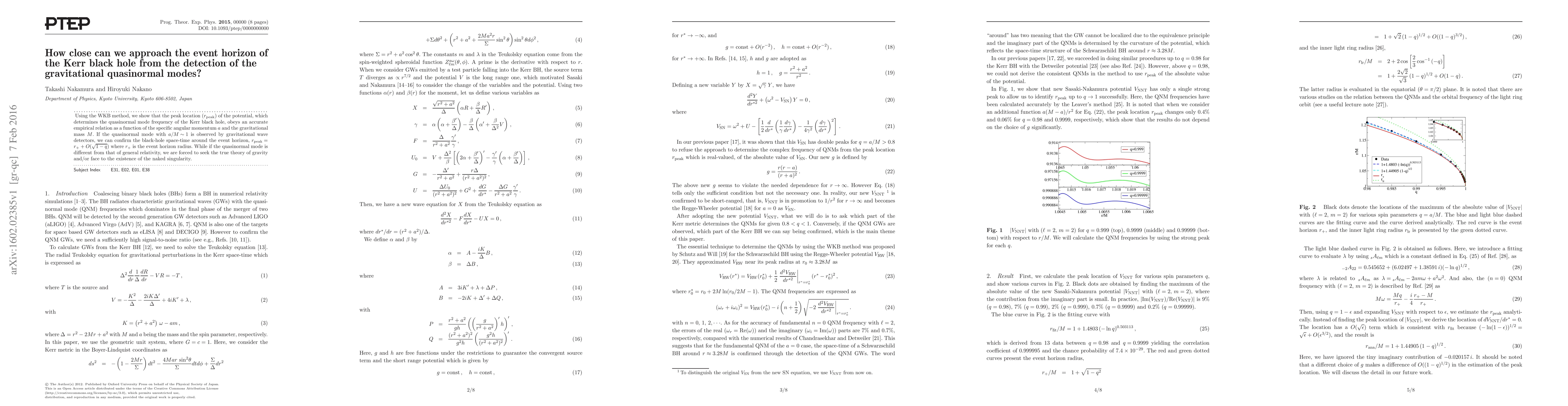 Using the WKB method, we show that the peak location ($r_{\rm peak}$) of the potential, which determines the quasinormal mode frequency of the Kerr black hole, obeys an accurate empirical relation as a function of the specific angular momentum $a$ and the gravitational mass $M$. If the quasinormal mode with $a/M \sim 1$ is observed by gravitational wave detectors, we can confirm the black-hole space-time around the event horizon, $r_{\rm peak}=r_+ +O(\sqrt{1-q})$ where $r_+$ is the event horizon radius. While if the quasinormal mode is different from that of general relativity, we are forced to seek the true theory of gravity and/or face to the existence of the naked singularity.