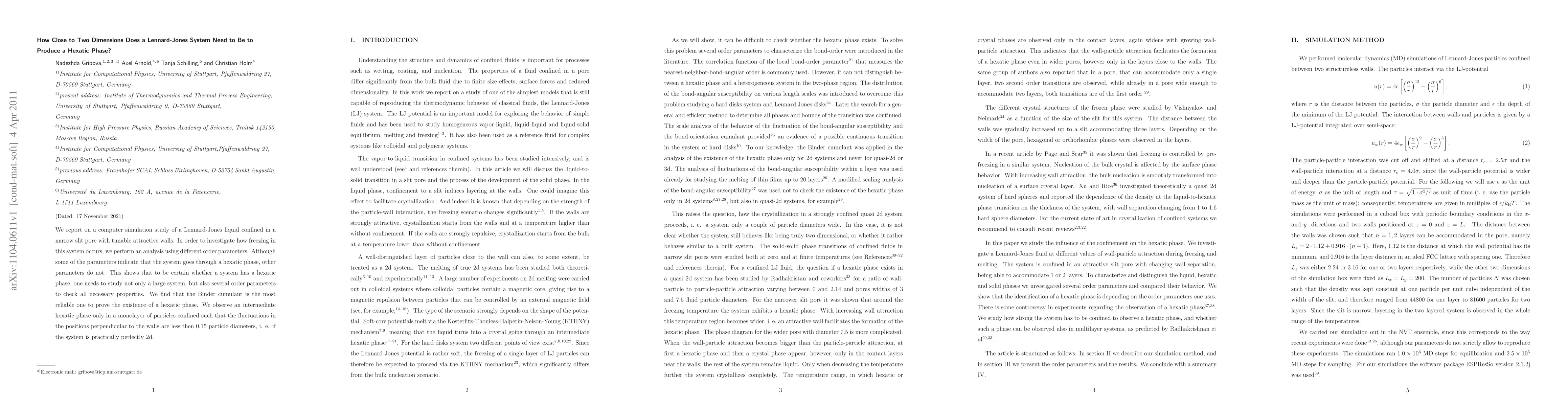We report on a computer simulation study of a Lennard-Jones liquid confined in a narrow slit pore with tunable attractive walls. In order to investigate how freezing in this system occurs, we perform an analysis using different order parameters. Although some of the parameters indicate that the system goes through a hexatic phase, other parameters do not. This shows that to be certain whether a system has a hexatic phase, one needs to study not only a large system, but also several order parameters to check all necessary properties. We find that the Binder cumulant is the most reliable one to prove the existence of a hexatic phase. We observe an intermediate hexatic phase only in a monolayer of particles confined such that the fluctuations in the positions perpendicular to the walls are less then 0.15 particle diameters, i. e. if the system is practically perfectly 2d.