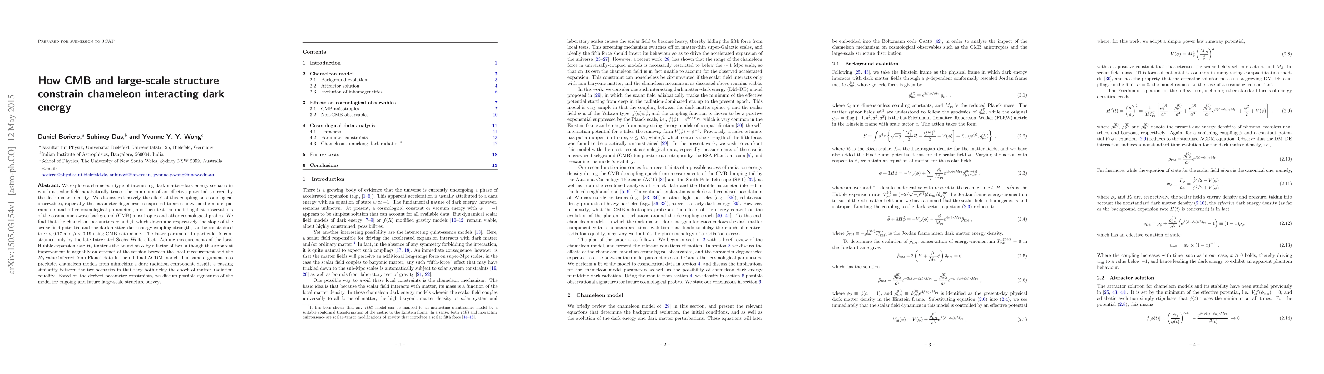 This paper investigates a chameleon model of interacting dark matter-dark energy, finding constraints on its parameters using CMB data and local Hubble expansion rate measurements. The model parameters $\alpha$ and $\beta$ are constrained to $\alpha < 0.17$ and $\beta < 0.19$, with the latter mainly constrained by the late Integrated Sachs-Wolfe effect. The study also discusses the model's potential signatures for future large-scale structure surveys.
