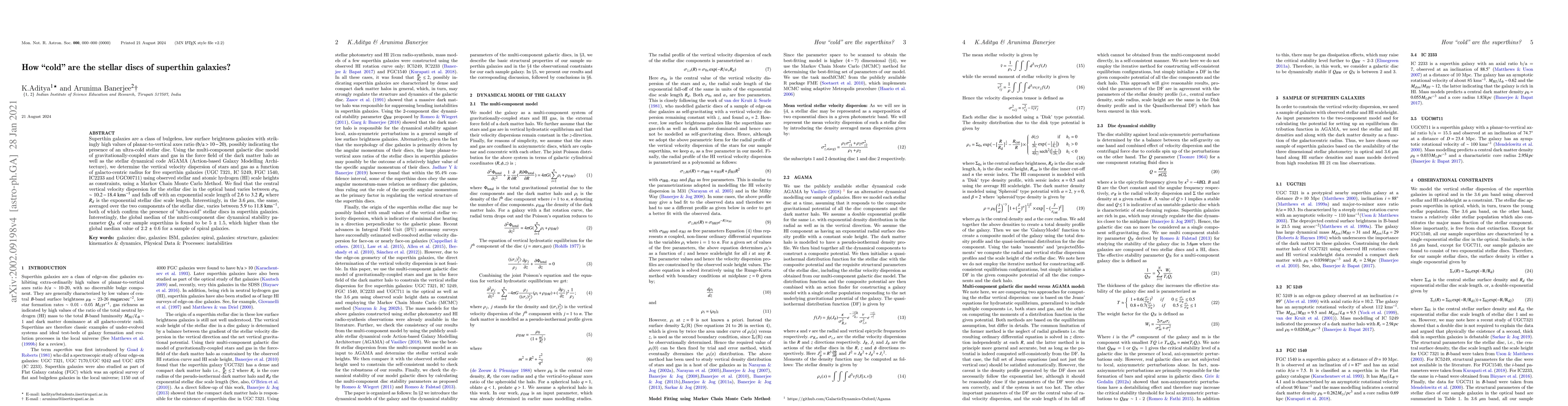 This study investigates the vertical velocity dispersion of stars and gas in five superthin galaxies using a multi-component galactic disc model and AGAMA. The findings reveal "ultra-cold" stellar discs with central vertical velocity dispersions ranging from 10.2 to 18.4 kms$^{-1}$ in the optical band, confirming the presence of such discs and indicating higher dynamical stability compared to typical spiral galaxies.