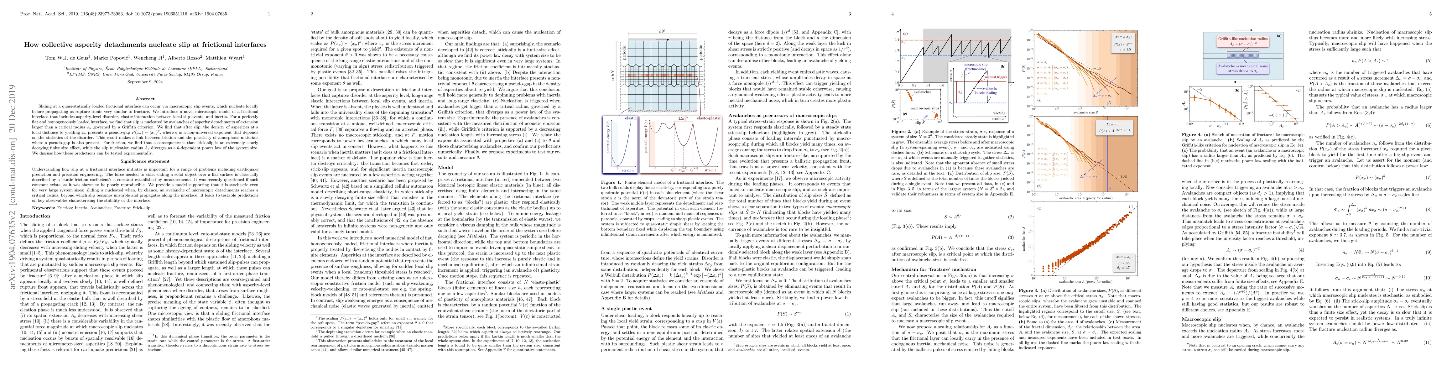 This paper proposes a microscopic model explaining how macroscopic slip events nucleate at frictional interfaces through asperity detachments governed by a Griffith criterion. It finds that slip initiation is linked to asperity detachments larger than a critical radius, and predicts a pseudo-gap in asperity density post-slip, suggesting a connection to the plasticity of amorphous materials.