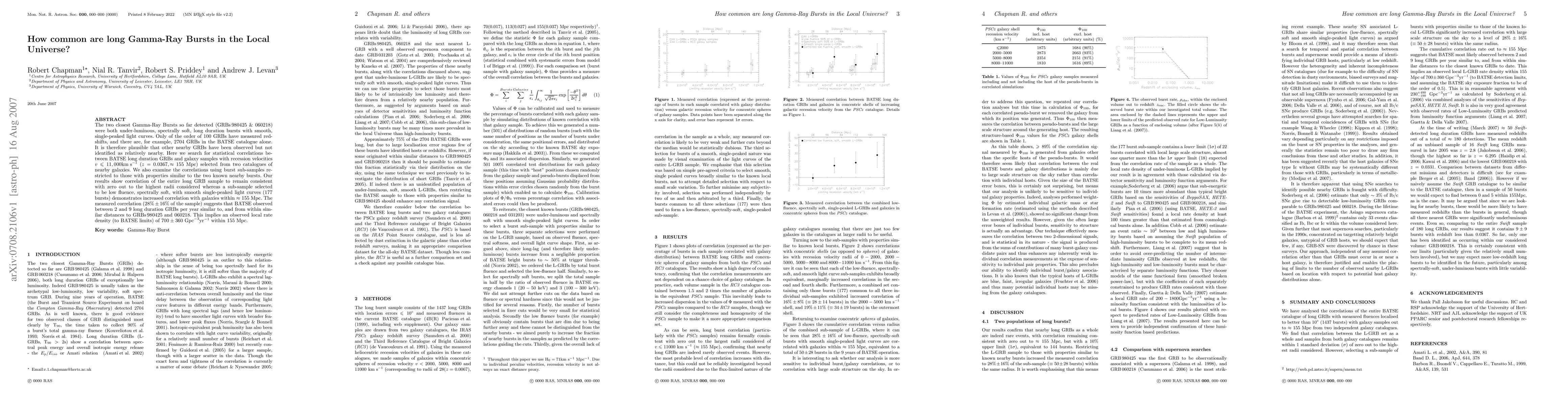 The two closest Gamma-Ray Bursts so far detected (GRBs 980425 & 060218) were both under-luminous, spectrally soft, long duration bursts with smooth, single-peaked light curves. Only of the order of 100 GRBs have measured redshifts, and there are, for example, 2704 GRBs in the BATSE catalogue alone. It is therefore plausible that other nearby GRBs have been observed but not identified as relatively nearby. Here we search for statistical correlations between BATSE long duration GRBs and galaxy samples with recession velocities v <= 11,000 km/s (z = 0.0367, ~ 155 Mpc) selected from two catalogues of nearby galaxies. We also examine the correlations using burst sub-samples restricted to those with properties similar to the two known nearby bursts. Our results show correlation of the entire long GRB sample to remain consistent with zero out to the highest radii considered whereas a sub-sample selected to be low fluence, spectrally soft, with smooth single-peaked light curves (177 bursts) demonstrates increased correlation with galaxies within ~ 155 Mpc. The measured correlation (28% +/- 16% of the sample) suggests that BATSE observed between 2 and 9 long duration GRBs per year similar to, and from within similar distances to GRBs 980425 and 060218. This implies an observed local rate density (to BATSE limits) of 700 +/- 360 Gpc^{-3}yr^{-1} within 155 Mpc.