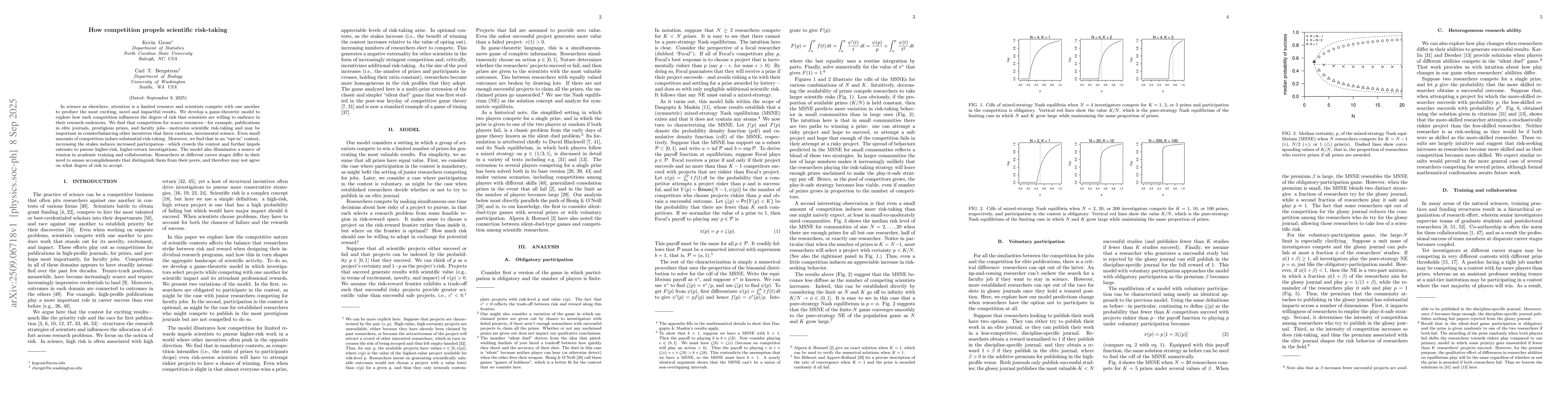 In science as elsewhere, attention is a limited resource and scientists compete with one another to produce the most exciting, novel and impactful results. We develop a game-theoretic model to explore how such competition influences the degree of risk that scientists are willing to embrace in their research endeavors. We find that competition for scarce resources -- for example, publications in elite journals, prestigious prizes, and faculty jobs -- motivates scientific risk-taking and may be important in counterbalancing other incentives that favor cautious, incremental science. Even small amounts of competition induce substantial risk-taking. Moreover, we find that in an ``opt-in'' contest, increasing the stakes induces increased participation -- which crowds the contest and further impels entrants to pursue higher-risk, higher-return investigations. The model also illuminates a source of tension in academic training and collaboration. Researchers at different career stages differ in their need to amass accomplishments that distinguish them from their peers, and therefore may not agree on what degree of risk to accept.