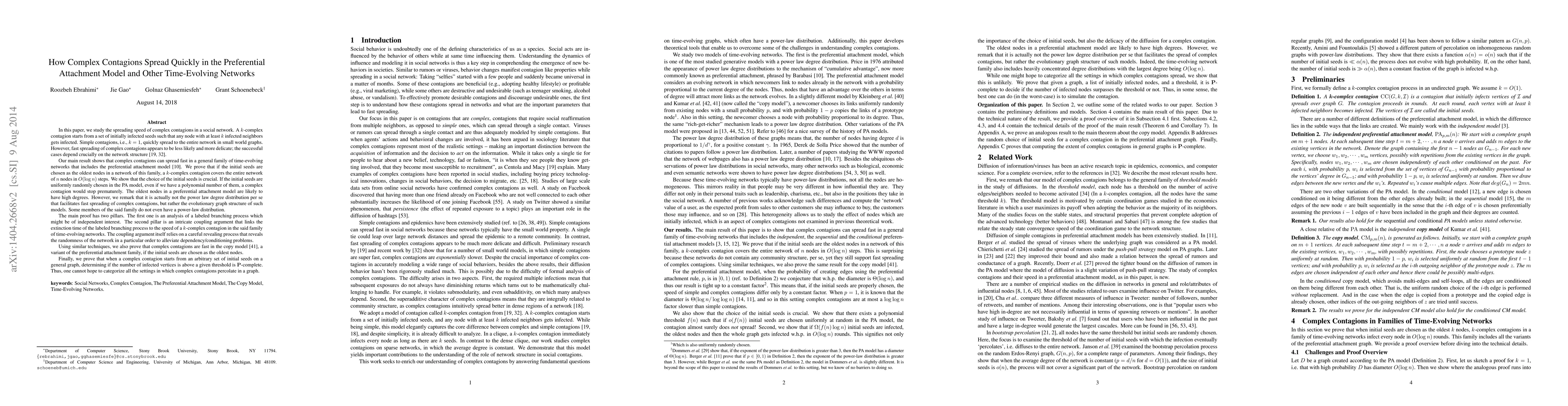 In this paper, we study the spreading speed of complex contagions in a social network. A $k$-complex contagion starts from a set of initially infected seeds such that any node with at least $k$ infected neighbors gets infected. Simple contagions, i.e., $k=1$, quickly spread to the entire network in small world graphs. However, fast spreading of complex contagions appears to be less likely and more delicate; the successful cases depend crucially on the network structure~\cite{G08,Ghasemiesfeh:2013:CCW}. Our main result shows that complex contagions can spread fast in a general family of time-evolving networks that includes the preferential attachment model~\cite{barabasi99emergence}. We prove that if the initial seeds are chosen as the oldest nodes in a network of this family, a $k$-complex contagion covers the entire network of $n$ nodes in $O(\log n)$ steps. We show that the choice of the initial seeds is crucial. If the initial seeds are uniformly randomly chosen in the PA model, even with a polynomial number of them, a complex contagion would stop prematurely. The oldest nodes in a preferential attachment model are likely to have high degrees. However, we remark that it is actually not the power law degree distribution per se that facilitates fast spreading of complex contagions, but rather the evolutionary graph structure of such models. Some members of the said family do not even have a power-law distribution. We also prove that complex contagions are fast in the copy model~\cite{KumarRaRa00}, a variant of the preferential attachment family. Finally, we prove that when a complex contagion starts from an arbitrary set of initial seeds on a general graph, determining if the number of infected vertices is above a given threshold is $\mathbf{P}$-complete. Thus, one cannot hope to categorize all the settings in which complex contagions percolate in a graph.