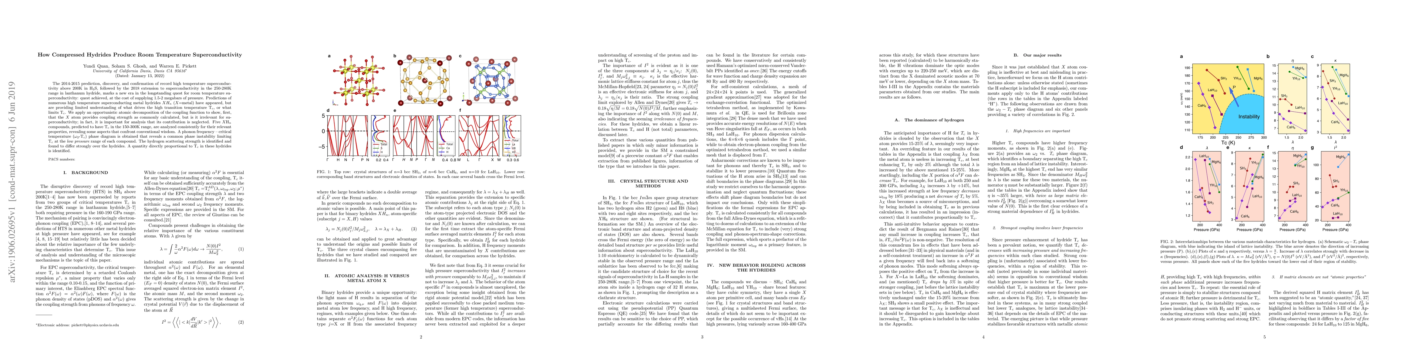 This paper investigates the mechanisms behind room temperature superconductivity in compressed hydrides, revealing that while metal atoms contribute to coupling strength, they are not the primary drivers of high transition temperatures. The study identifies a common phase instability limiting T$_c$ at low pressures and highlights the significant role of hydrogen scattering strength in determining superconductivity.