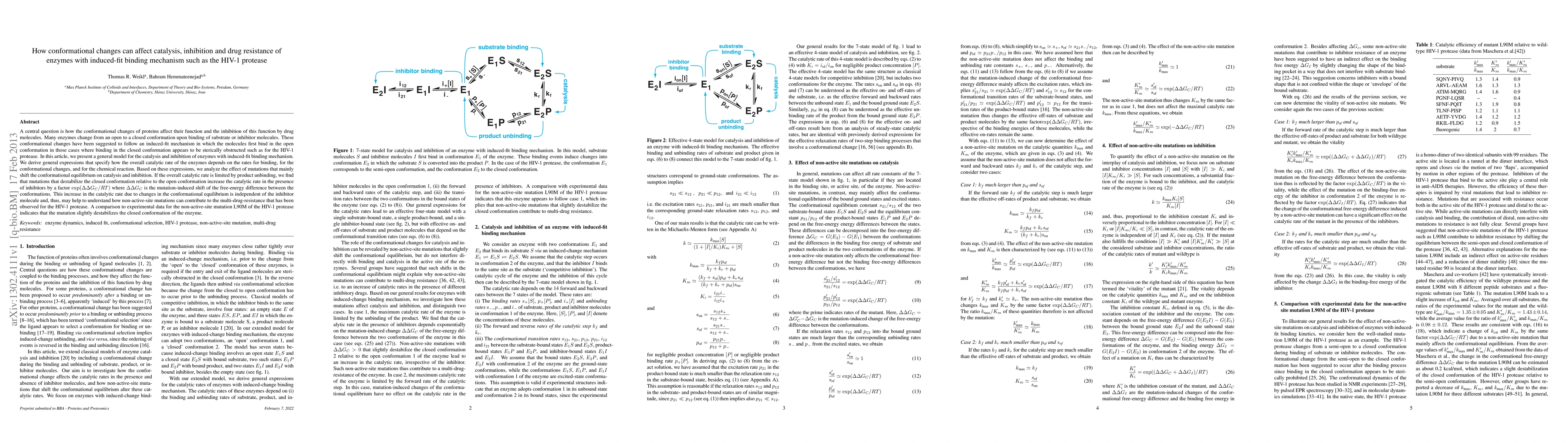 This paper explores how conformational changes in enzymes with an induced-fit binding mechanism, such as HIV-1 protease, influence catalysis, inhibition, and drug resistance. It develops a model showing that mutations shifting the conformational equilibrium can enhance catalytic rates in the presence of inhibitors, potentially explaining multi-drug resistance.