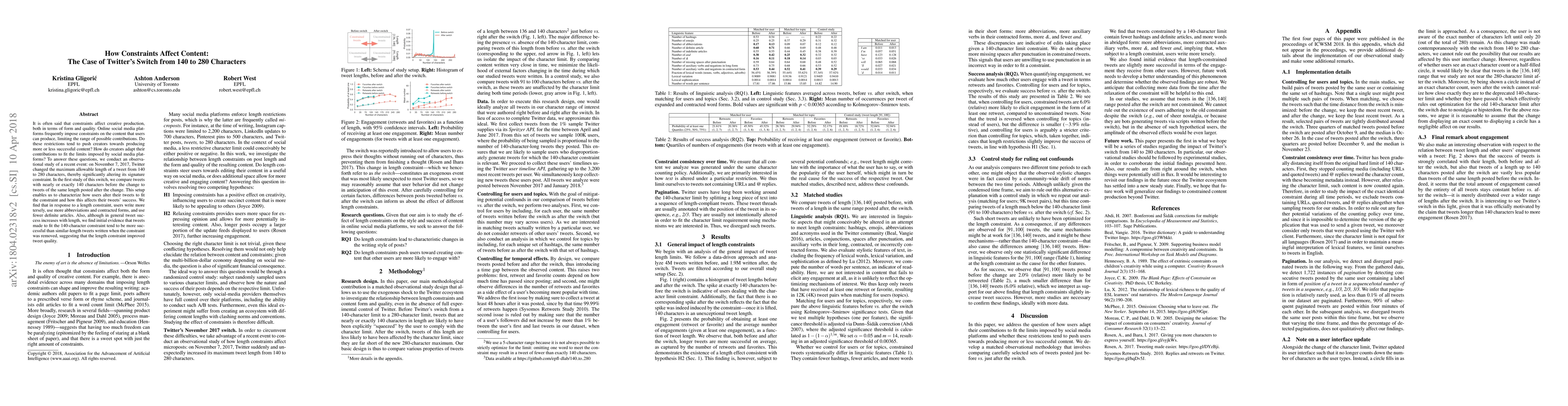 It is often said that constraints affect creative production, both in terms of form and quality. Online social media platforms frequently impose constraints on the content that users can produce, limiting the range of possible contributions. Do these restrictions tend to push creators towards producing more or less successful content? How do creators adapt their contributions to fit the limits imposed by social media platforms? To answer these questions, we conduct an observational study of a recent event: on November 7, 2017, Twitter changed the maximum allowable length of a tweet from 140 to 280 characters, thereby significantly altering its signature constraint. In the first study of this switch, we compare tweets with nearly or exactly 140 characters before the change to tweets of the same length posted after the change. This setup enables us to characterize how users alter their tweets to fit the constraint and how this affects their tweets' success. We find that in response to a length constraint, users write more tersely, use more abbreviations and contracted forms, and use fewer definite articles. Also, although in general tweet success increases with length, we find initial evidence that tweets made to fit the 140-character constraint tend to be more successful than similar-length tweets written when the constraint was removed, suggesting that the length constraint improved tweet quality.