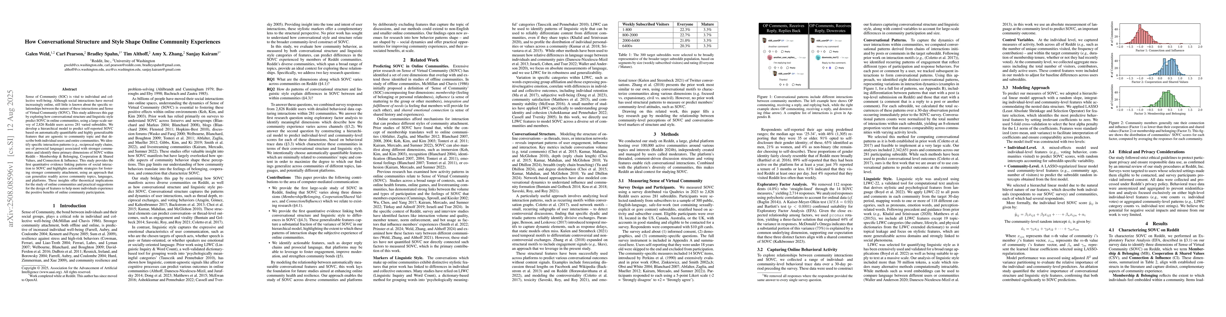 Sense of Community (SOC) is vital to individual and collective well-being. Although social interactions have moved increasingly online, still little is known about the specific relationships between the nature of these interactions and Sense of Virtual Community (SOVC). This study addresses this gap by exploring how conversational structure and linguistic style predict SOVC in online communities, using a large-scale survey of 2,826 Reddit users across 281 varied subreddits. We develop a hierarchical model to predict self-reported SOVC based on automatically quantifiable and highly generalizable features that are agnostic to community topic and that describe both individual users and entire communities. We identify specific interaction patterns (e.g., reciprocal reply chains, use of prosocial language) associated with stronger communities and identify three primary dimensions of SOVC within Reddit -- Membership & Belonging, Cooperation & Shared Values, and Connection & Influence. This study provides the first quantitative evidence linking patterns of social interaction to SOVC and highlights actionable strategies for fostering stronger community attachment, using an approach that can generalize readily across community topics, languages, and platforms. These insights offer theoretical implications for the study of online communities and practical suggestions for the design of features to help more individuals experience the positive benefits of online community participation.