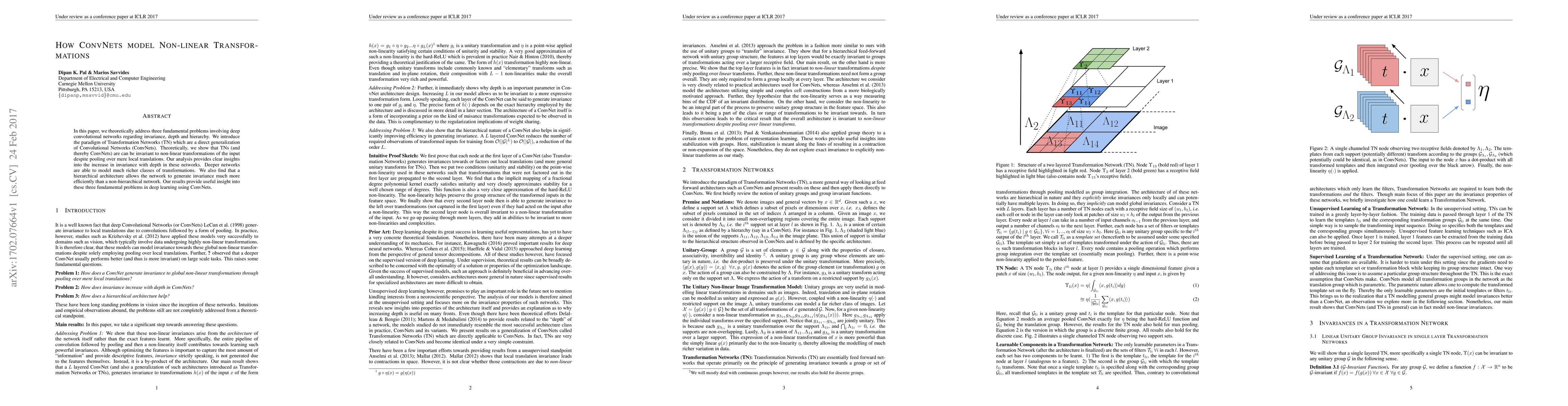 In this paper, we theoretically address three fundamental problems involving deep convolutional networks regarding invariance, depth and hierarchy. We introduce the paradigm of Transformation Networks (TN) which are a direct generalization of Convolutional Networks (ConvNets). Theoretically, we show that TNs (and thereby ConvNets) are can be invariant to non-linear transformations of the input despite pooling over mere local translations. Our analysis provides clear insights into the increase in invariance with depth in these networks. Deeper networks are able to model much richer classes of transformations. We also find that a hierarchical architecture allows the network to generate invariance much more efficiently than a non-hierarchical network. Our results provide useful insight into these three fundamental problems in deep learning using ConvNets.