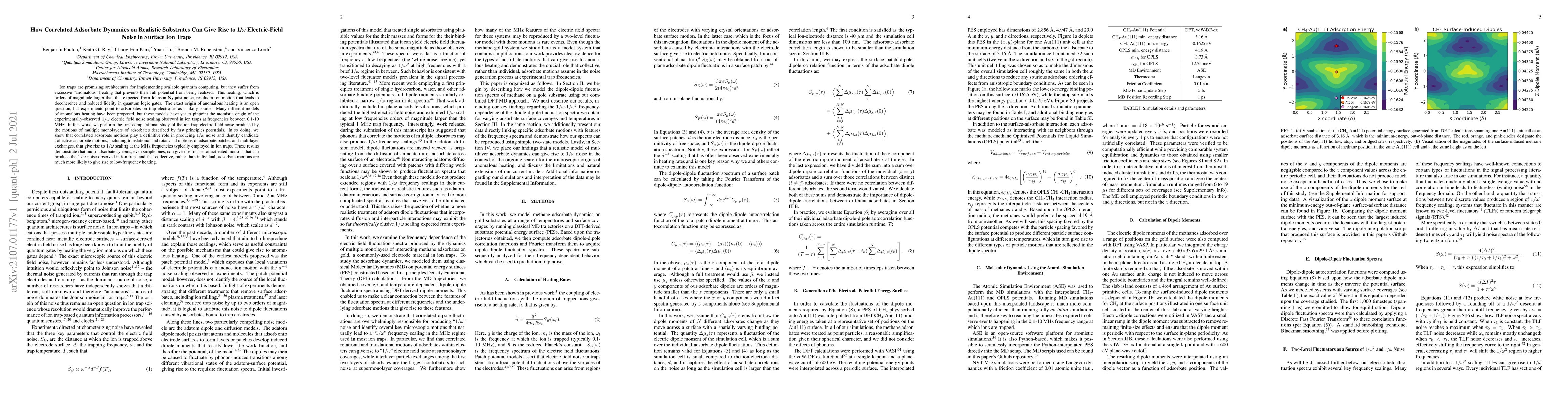 Ion traps are promising architectures for implementing scalable quantum computing, but they suffer from excessive "anomalous" heating that prevents their full potential from being realized. This heating, which is orders of magnitude larger than that expected from Johnson-Nyquist noise, results in ion motion that leads to decoherence and reduced fidelity in quantum logic gates. The exact origin of anomalous heating is an open question, but experiments point to adsorbates on trap electrodes as a likely source. Many different models of anomalous heating have been proposed, but these models have yet to pinpoint the atomistic origin of the experimentally-observed $1/\omega$ electric field noise scaling observed in ion traps at frequencies between 0.1-10 MHz. In this work, we perform the first computational study of the ion trap electric field noise produced by the motions of multiple monolayers of adsorbates described by first principles potentials. In so doing, we show that correlated adsorbate motions play a definitive role in producing $1/\omega$ noise and identify candidate collective adsorbate motions, including translational and rotational motions of adsorbate patches and multilayer exchanges, that give rise to $1/\omega$ scaling at the MHz frequencies typically employed in ion traps. These results demonstrate that multi-adsorbate systems, even simple ones, can give rise to a set of activated motions that can produce the $1/\omega$ noise observed in ion traps and that collective, rather than individual, adsorbate motions are much more likely to give rise to low-frequency heating.