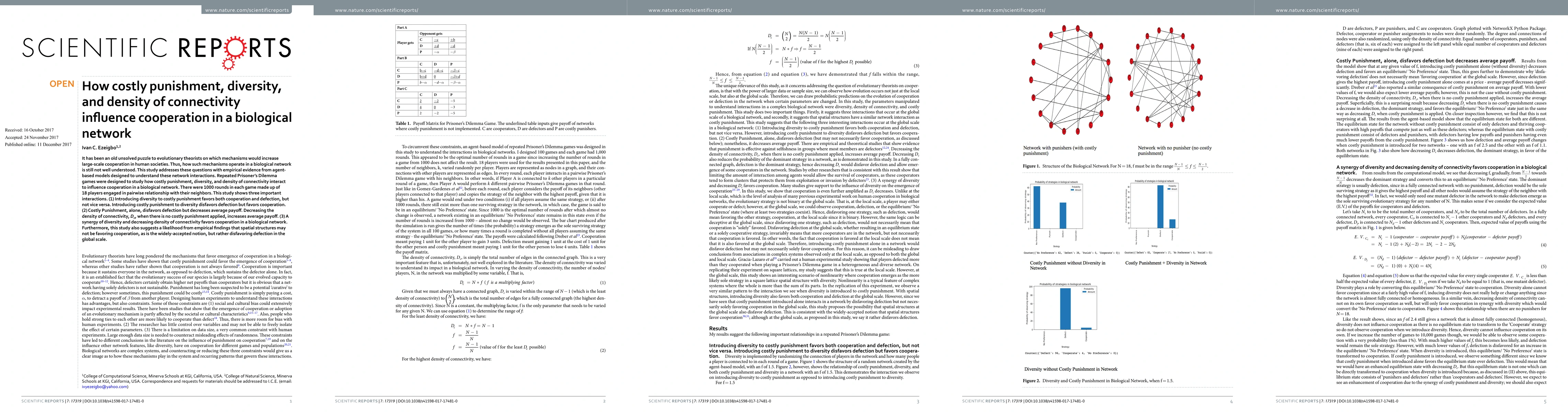 It has been an old unsolved puzzle to evolutionary theorists on which mechanisms would increase large-scale cooperation in human societies. Thus, how such mechanisms operate in a biological network is still not very understood. This study addresses these questions with empirical evidence from agent-based models designed to understand these network interactions. Repeated Prisoner's Dilemma games were designed to study how costly punishment, diversity, and density of connectivity interact to influence cooperation in a biological network. There are 1000 rounds in each game made up of 18 players engaged in pairwise relationship with their neighbors. This study shows three important interactions. (1) Introducing diversity to costly punishment favors both cooperation and defection, but not vice versa. Introducing costly punishment to diversity disfavors defection but favors cooperation. (2) Costly Punishment, alone, disfavors defection but decreases average payoff. Decreasing the density of connectivity, Dc, when there is no costly punishment applied, increases average payoff. (3) A synergy of diversity and decreasing density of connectivity favors cooperation in a biological network. Furthermore, this study also suggests a likelihood from empirical findings that spatial structures may not be favoring cooperation, as is the widely-accepted notion, but rather disfavoring defection in the global scale.